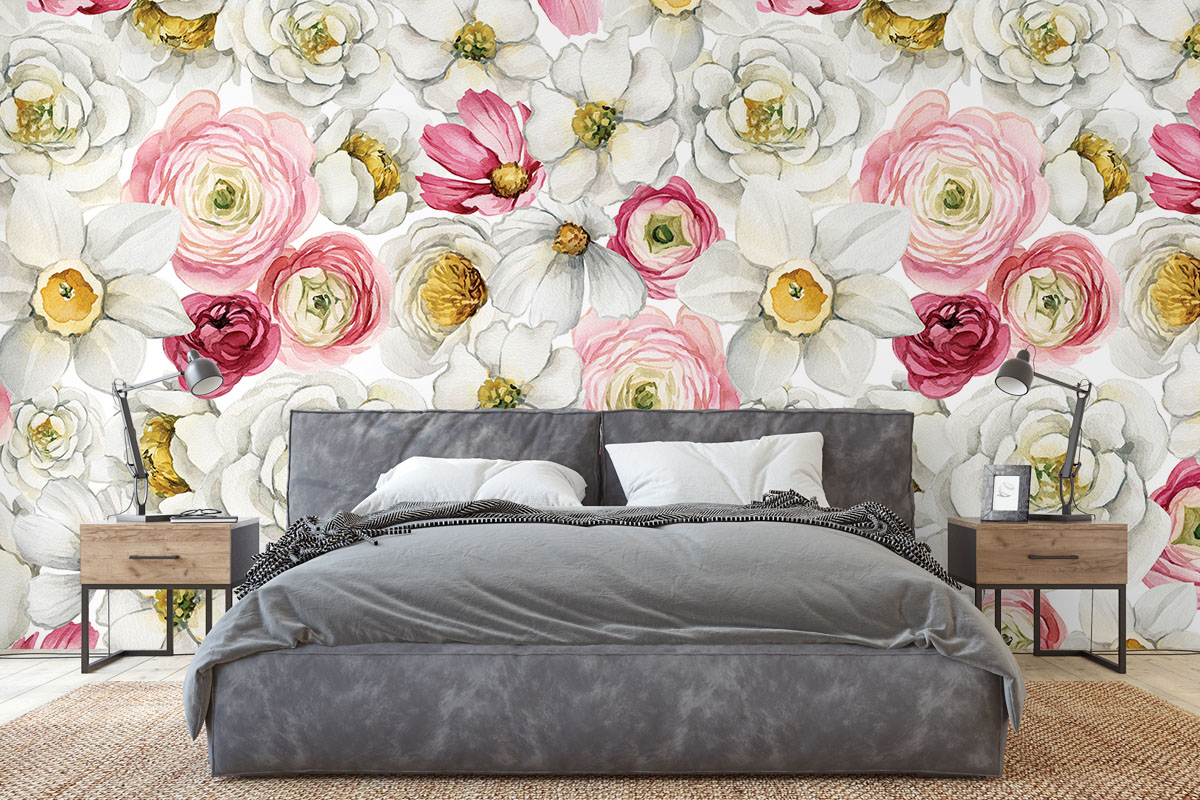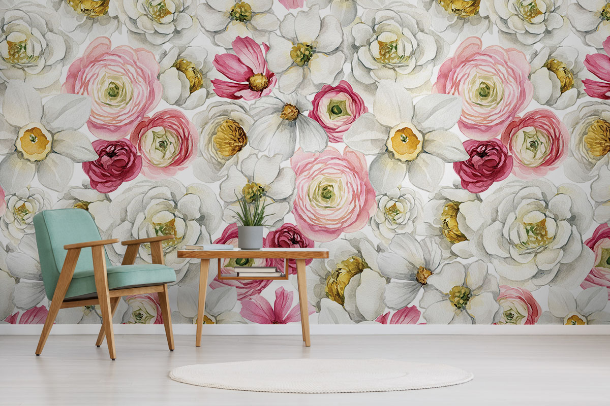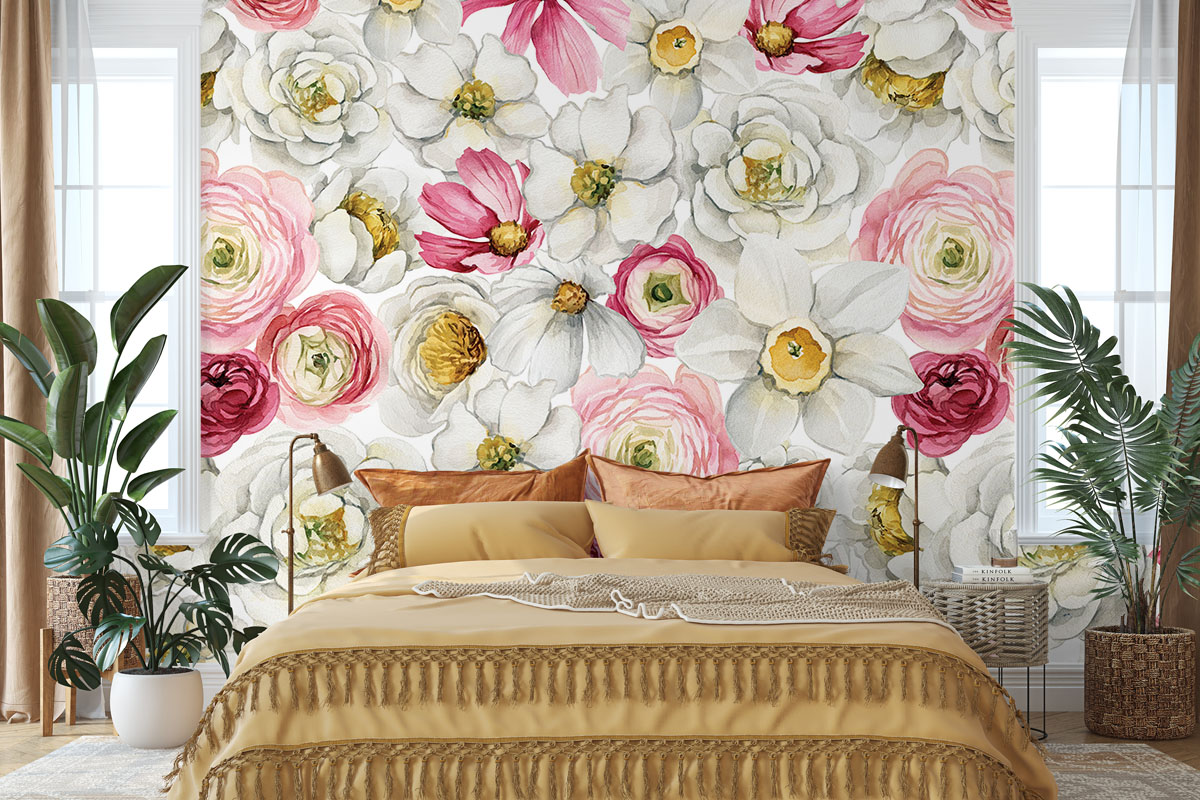 Wil je de muur combineren met verf? We hebben drie Flexa Pure kleuren geselecteerd die perfect matchen met dit fotobehang Zachte lentebloemen. Zo creëer je eenvoudig een harmonieus interieur.