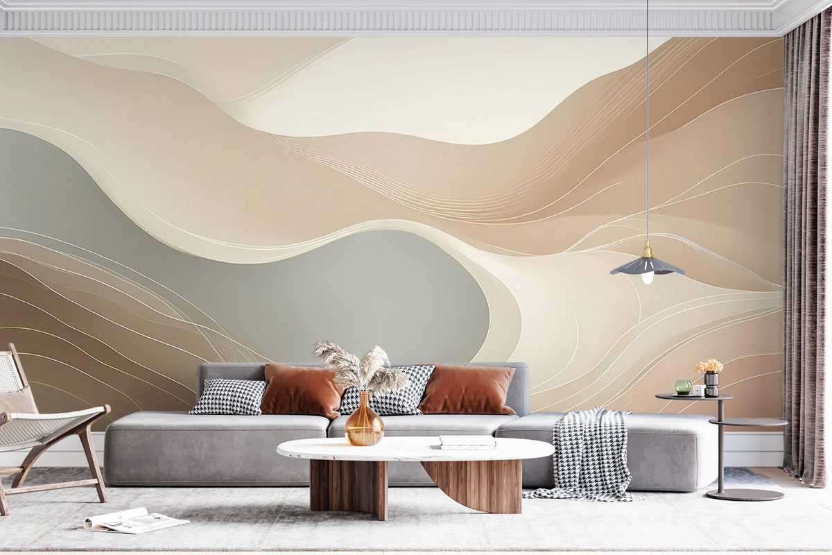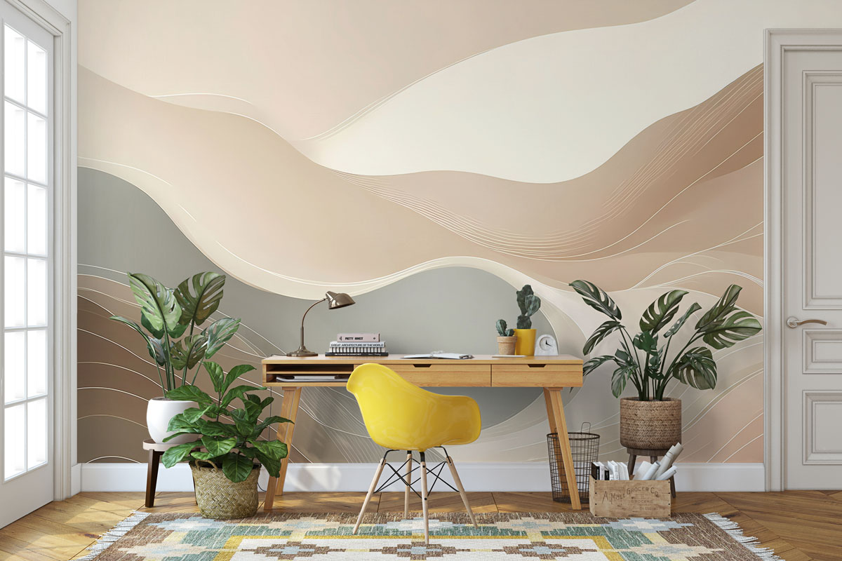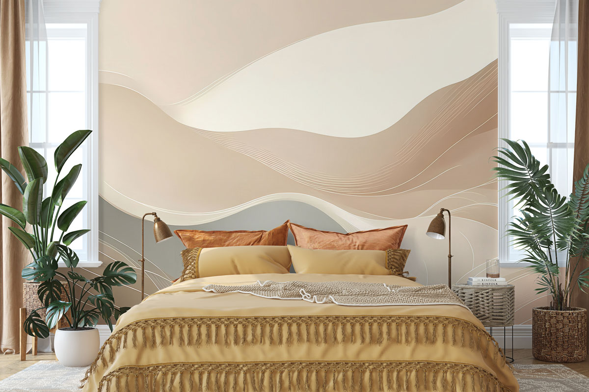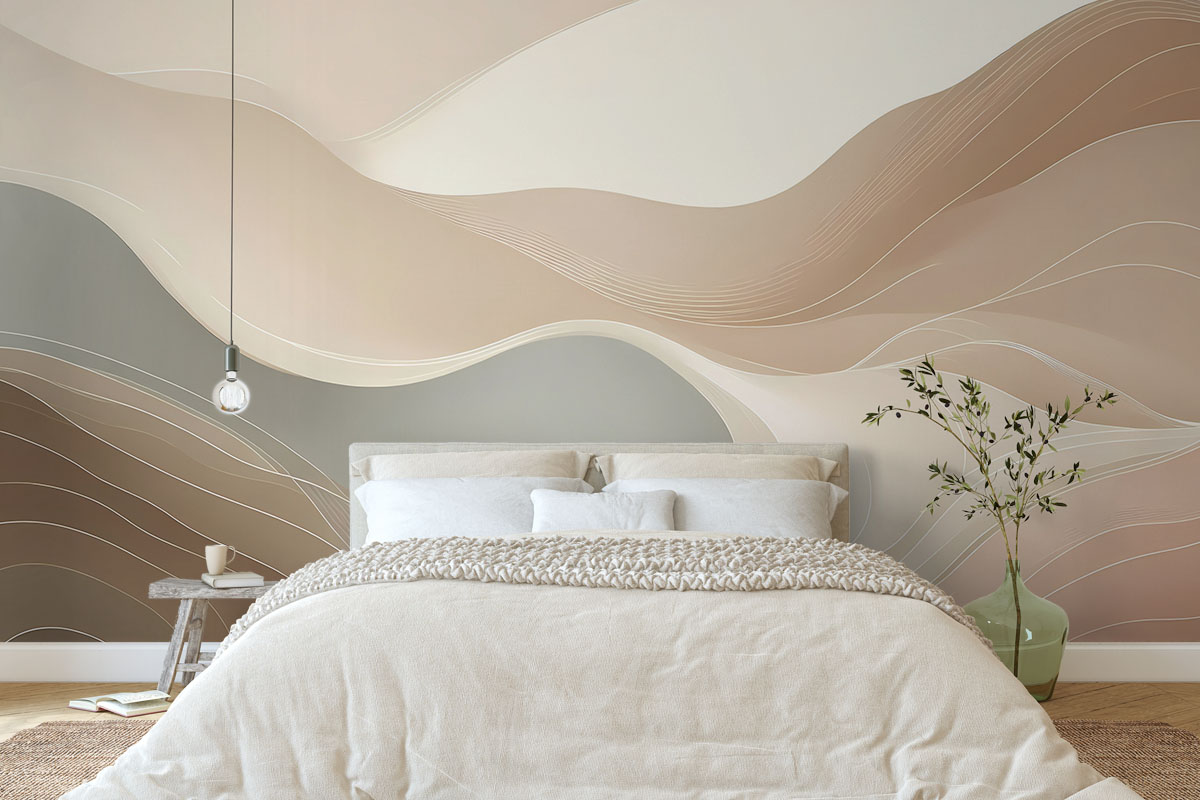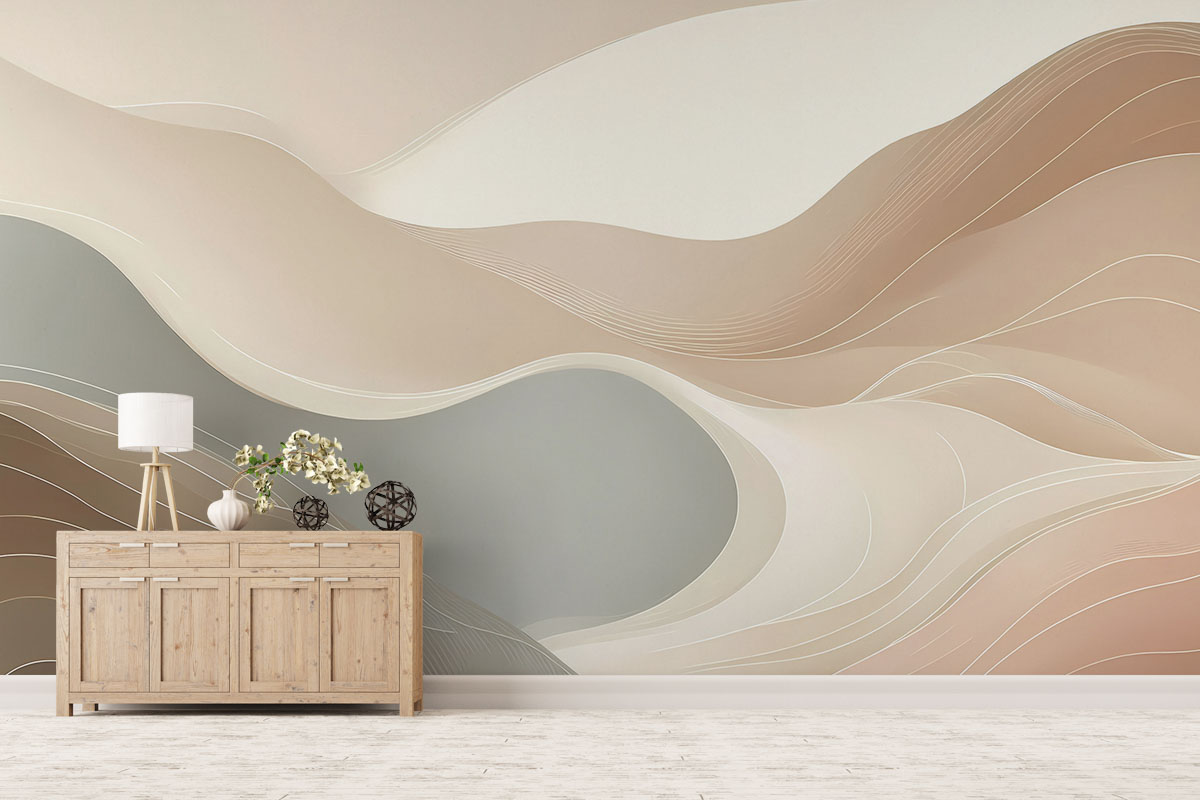 Vloeiende lijnen in zandbeige, grijs en poederroze vormen een sereen abstract duinlandschap.