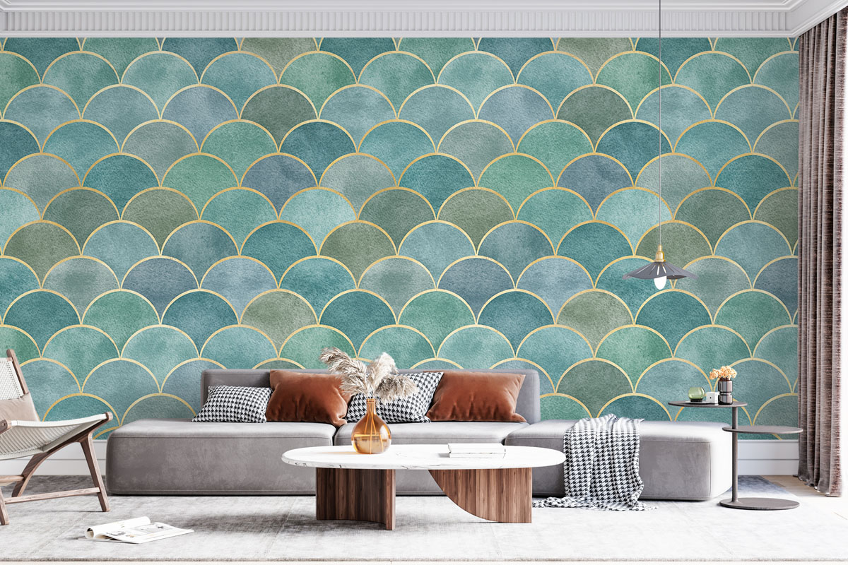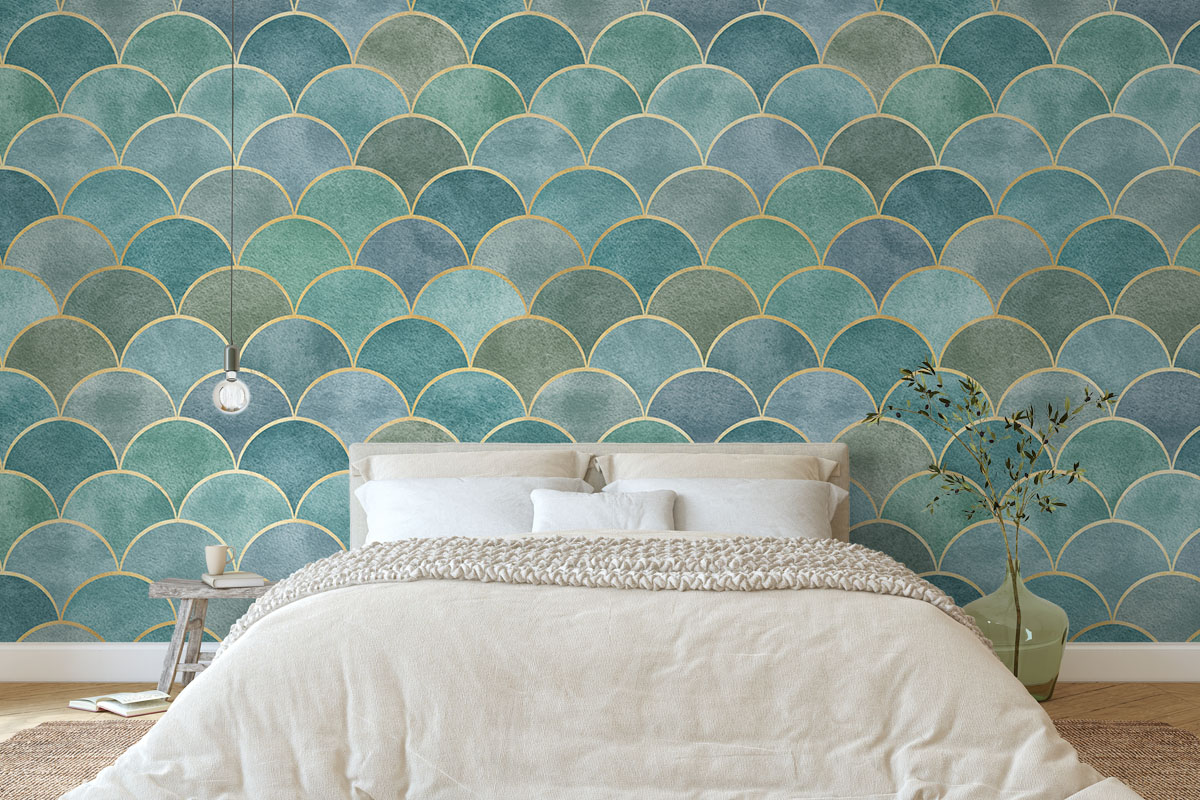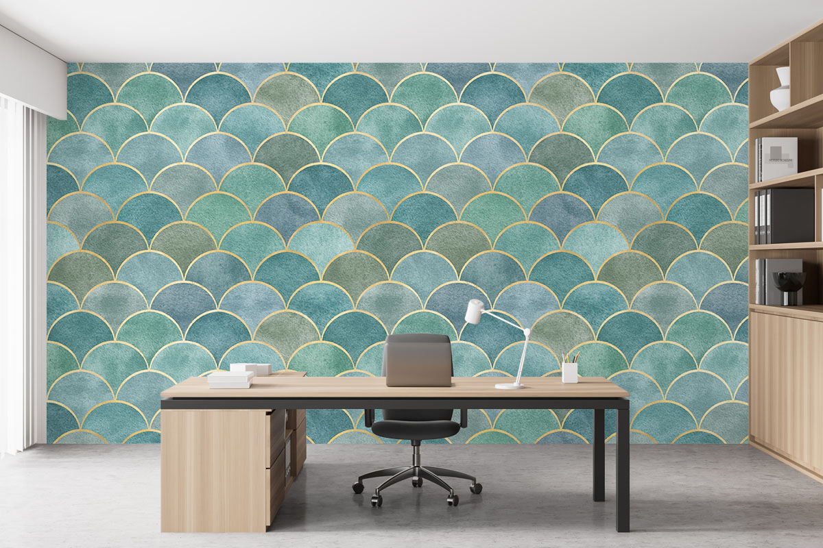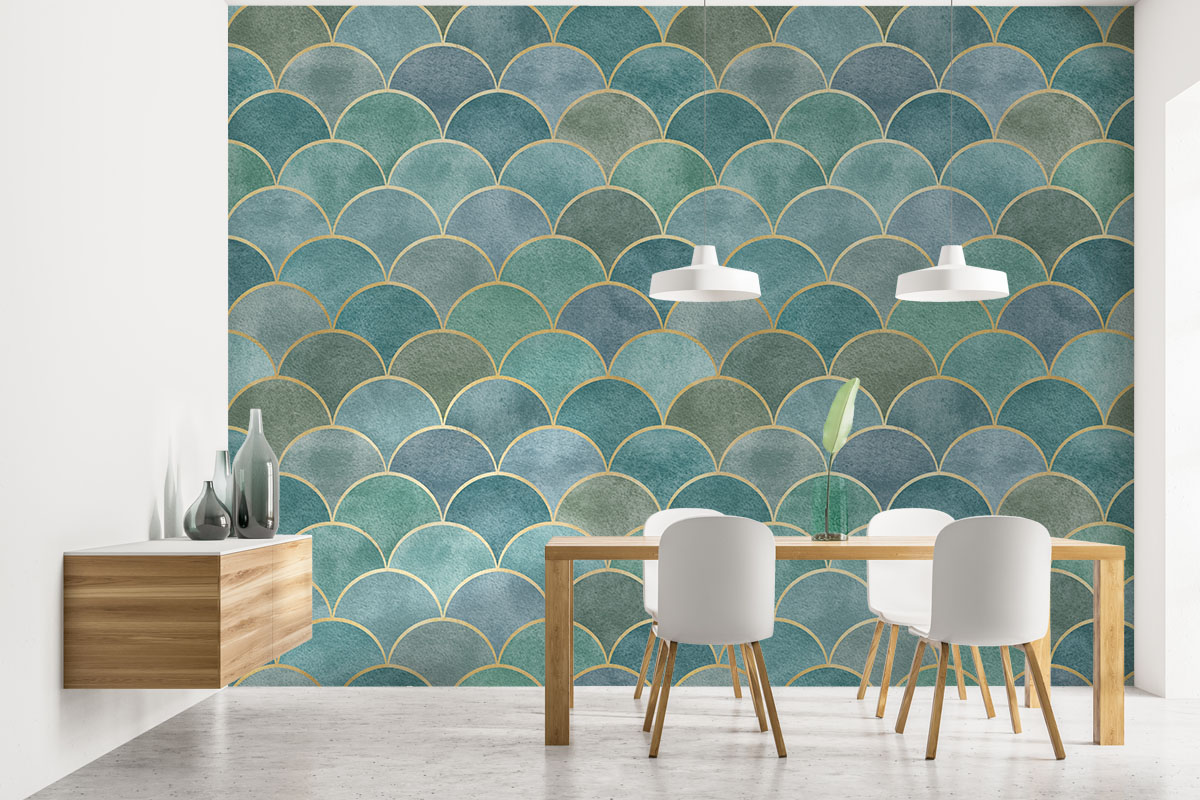 Jouw design Zeegroen schubben met gouden glans wordt geprint op hoogwaardig vliesbehang van premium kwaliteit. Dit stevige behang (200 g/m²) is duurzaam, krasvast en behoudt jarenlang zijn kleur en structuur — perfect voor elke woonruimte, van woonkamer tot slaapkamer of kantoor. Het fotobehang wordt volledig op maat gemaakt, zodat het ontwerp naadloos aansluit op jouw muur. Dankzij de gladde afwerking en strakke structuur komen kleuren en details prachtig tot leven.