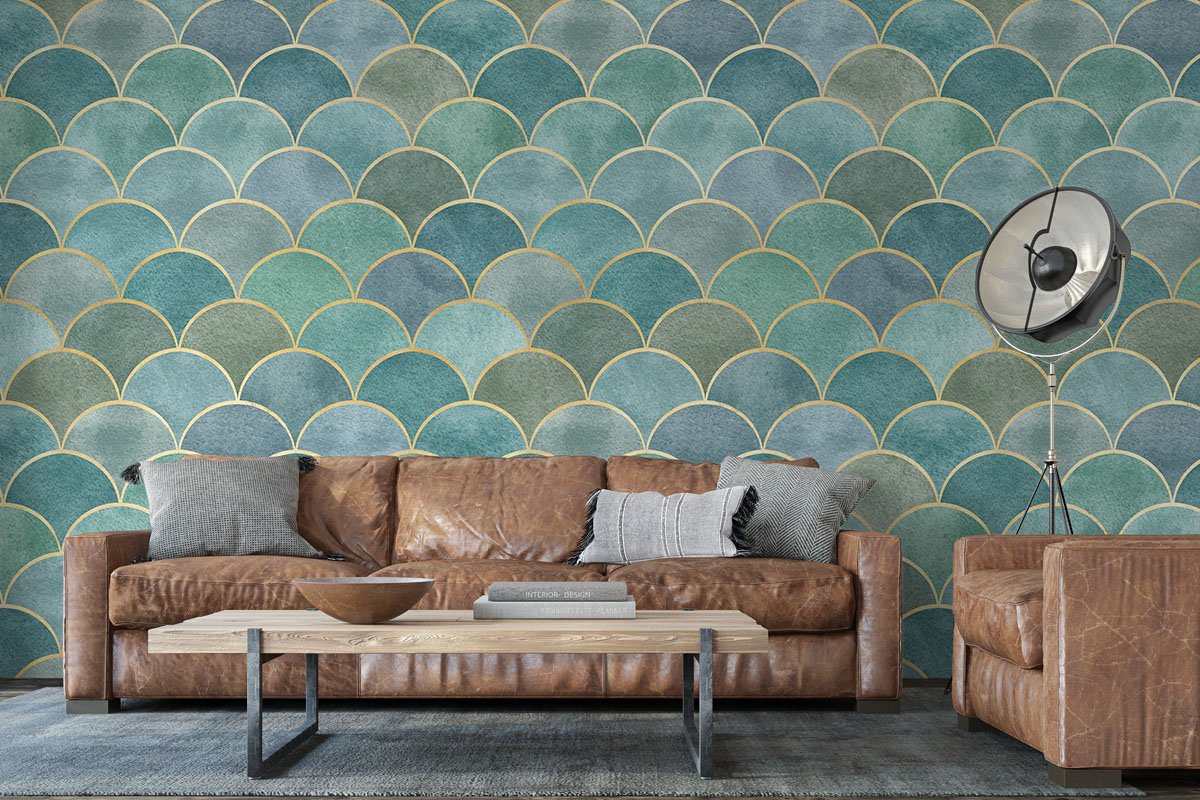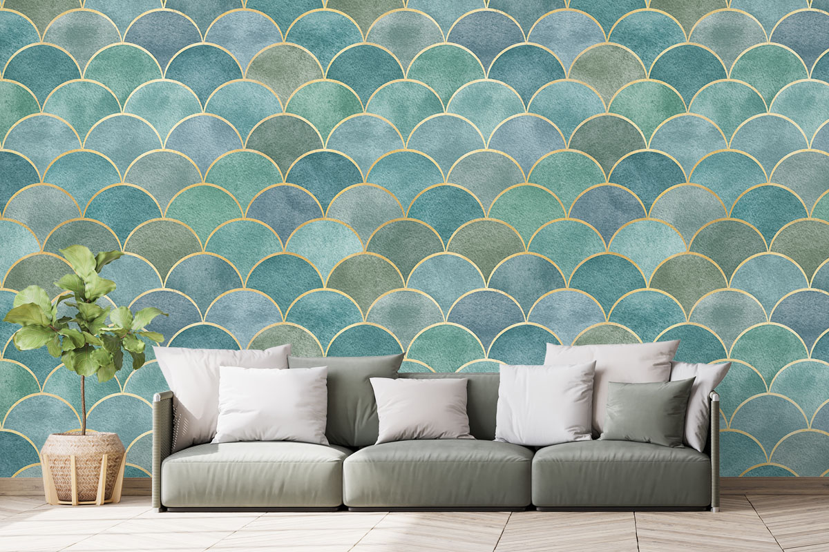 Wil je de muur combineren met verf? We hebben drie Flexa Pure kleuren geselecteerd die perfect matchen met dit fotobehang Zeegroen schubben met gouden glans. Zo creëer je eenvoudig een harmonieus interieur.