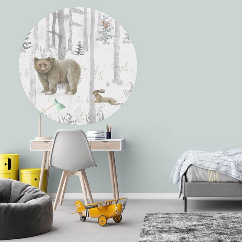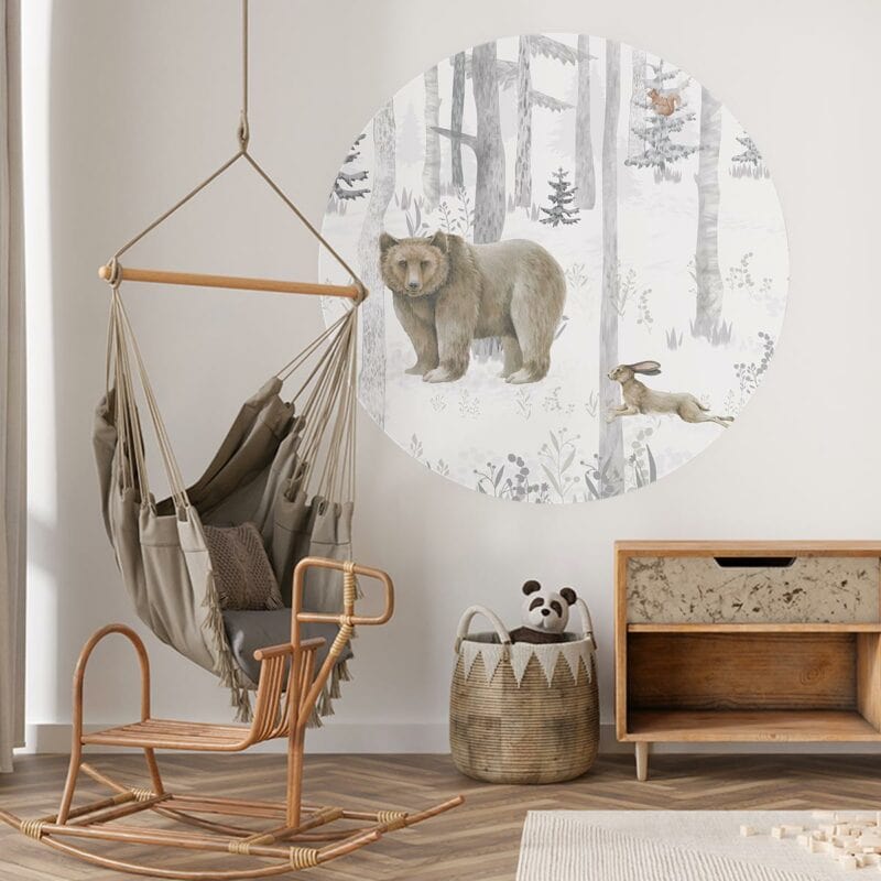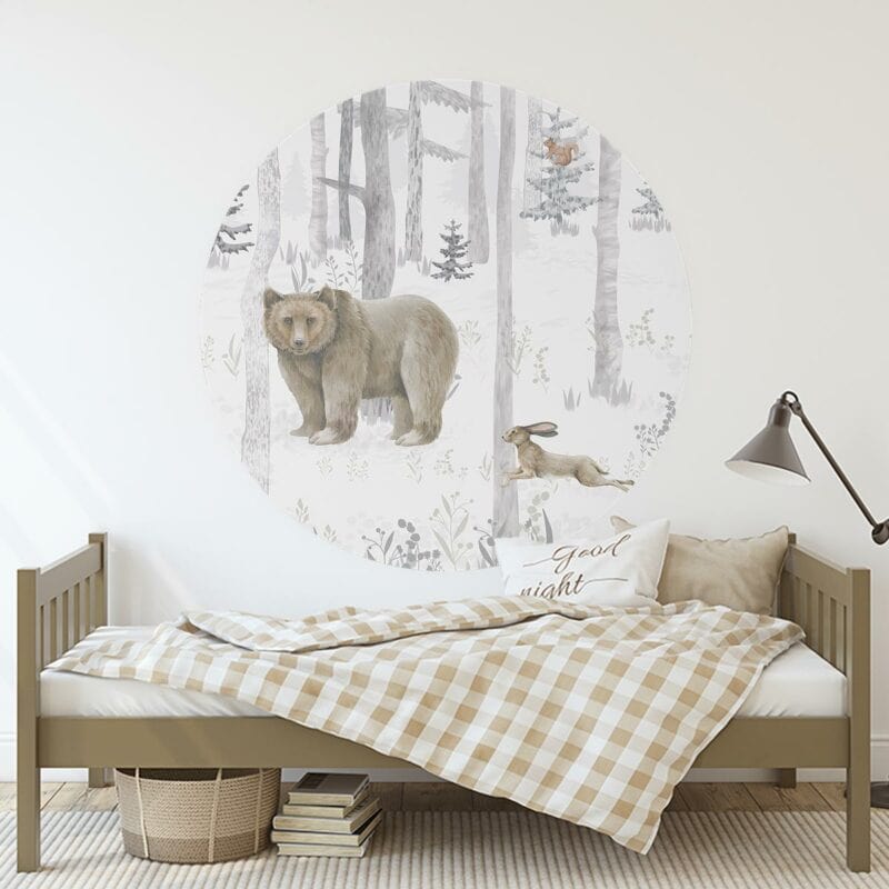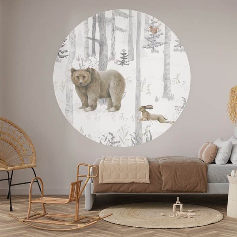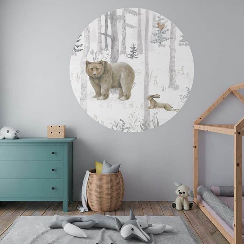 Met een behangcirkel (ook wel ronde muursticker genoemd) geef je de kinderkamer, babykamer, speelkamer of andere ruimte direct een nieuw en fris uiterlijk! Behangcirkel ‘Beer in het winterbos’ wordt op een kwalitatief hoog materiaal geprint, waardoor het design en kleuren goed tot zijn recht komen. Ook zijn onze behangcirkels weer gemakkelijk te verwijderen, zonder lijmresten achter te laten op de muur.
