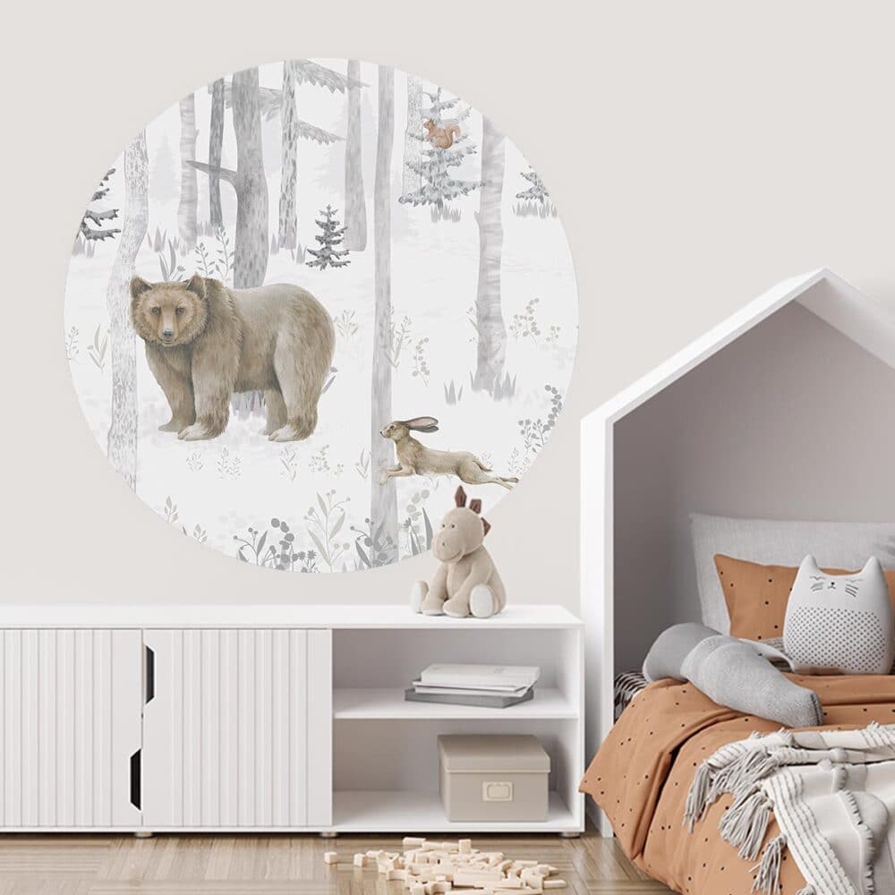 Met een behangcirkel (ook wel ronde muursticker genoemd) geef je de kinderkamer, babykamer, speelkamer of andere ruimte direct een nieuw en fris uiterlijk! Behangcirkel ‘Beer in het winterbos’ wordt op een kwalitatief hoog materiaal geprint, waardoor het design en kleuren goed tot zijn recht komen. Ook zijn onze behangcirkels weer gemakkelijk te verwijderen, zonder lijmresten achter te laten op de muur.