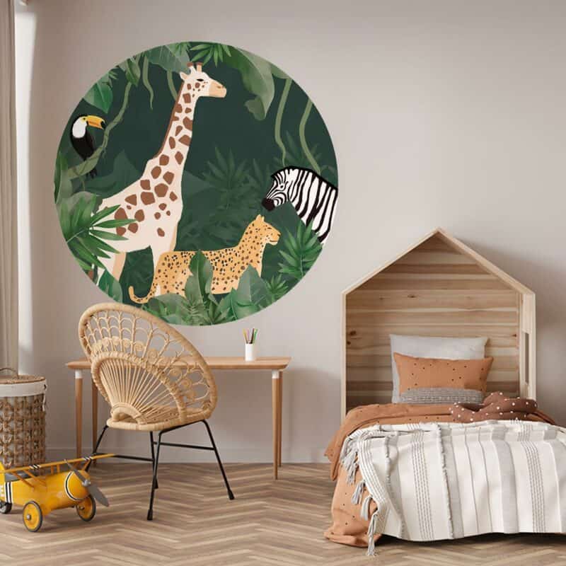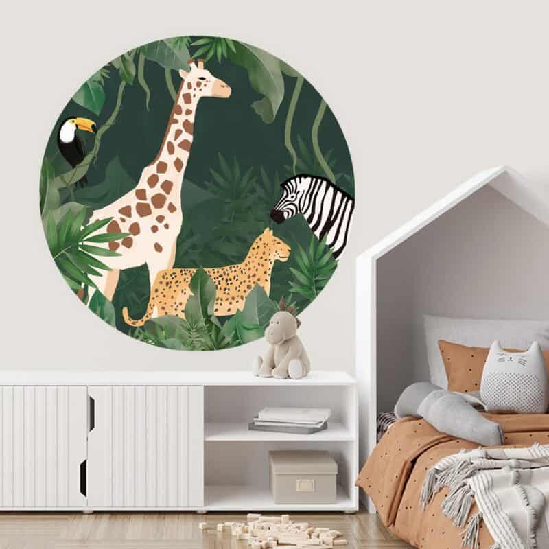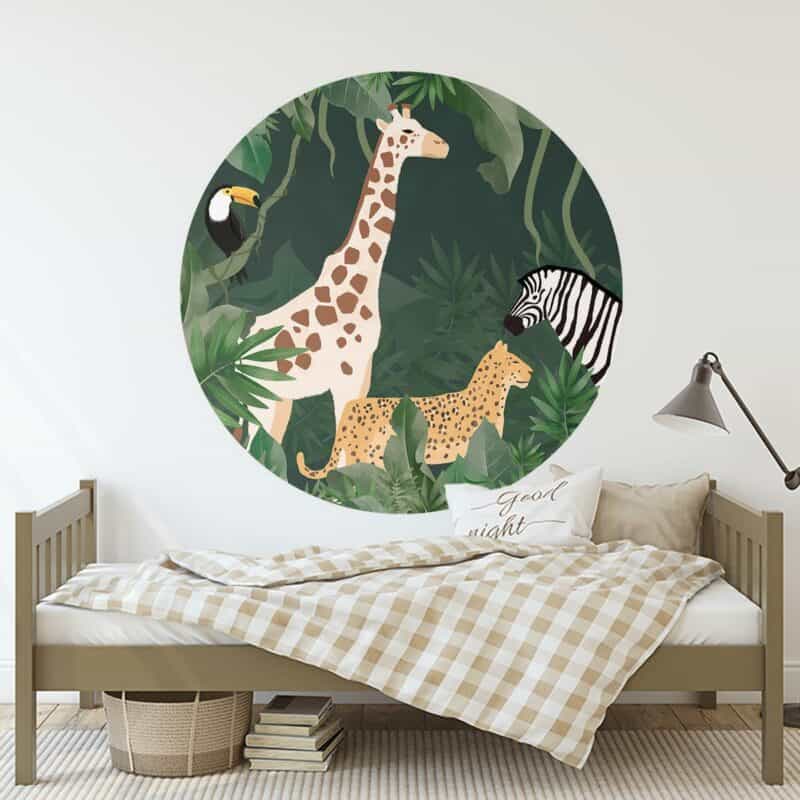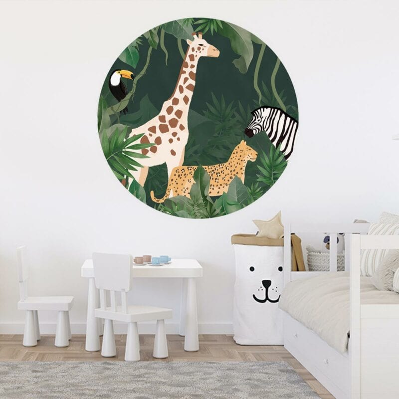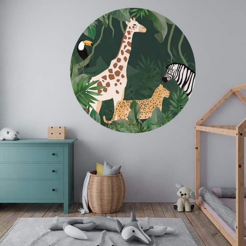 Met een behangcirkel (ook wel ronde muursticker genoemd) geef je de kinderkamer, babykamer, speelkamer of andere ruimte direct een nieuw en fris uiterlijk! Behangcirkel ‘Dieren in de groene jungle’ wordt op een kwalitatief hoog materiaal geprint, waardoor het design en kleuren goed tot zijn recht komen. Ook zijn onze behangcirkels weer gemakkelijk te verwijderen, zonder lijmresten achter te laten op de muur.