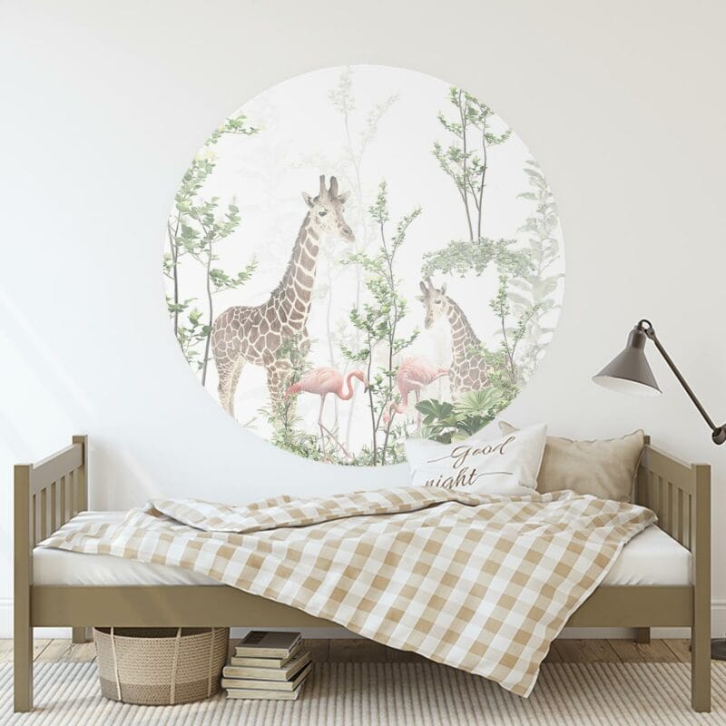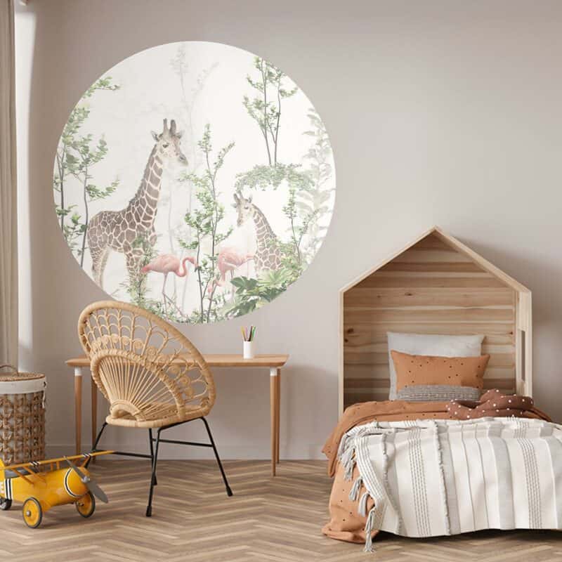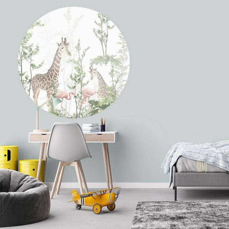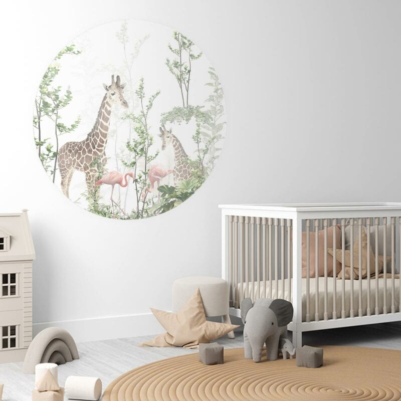 Kom tot rust in deze groene oase met olifanten, flamingo’s en giraffen… Deze dieren behangcirkel past perfect in een rustige kinderkamer.