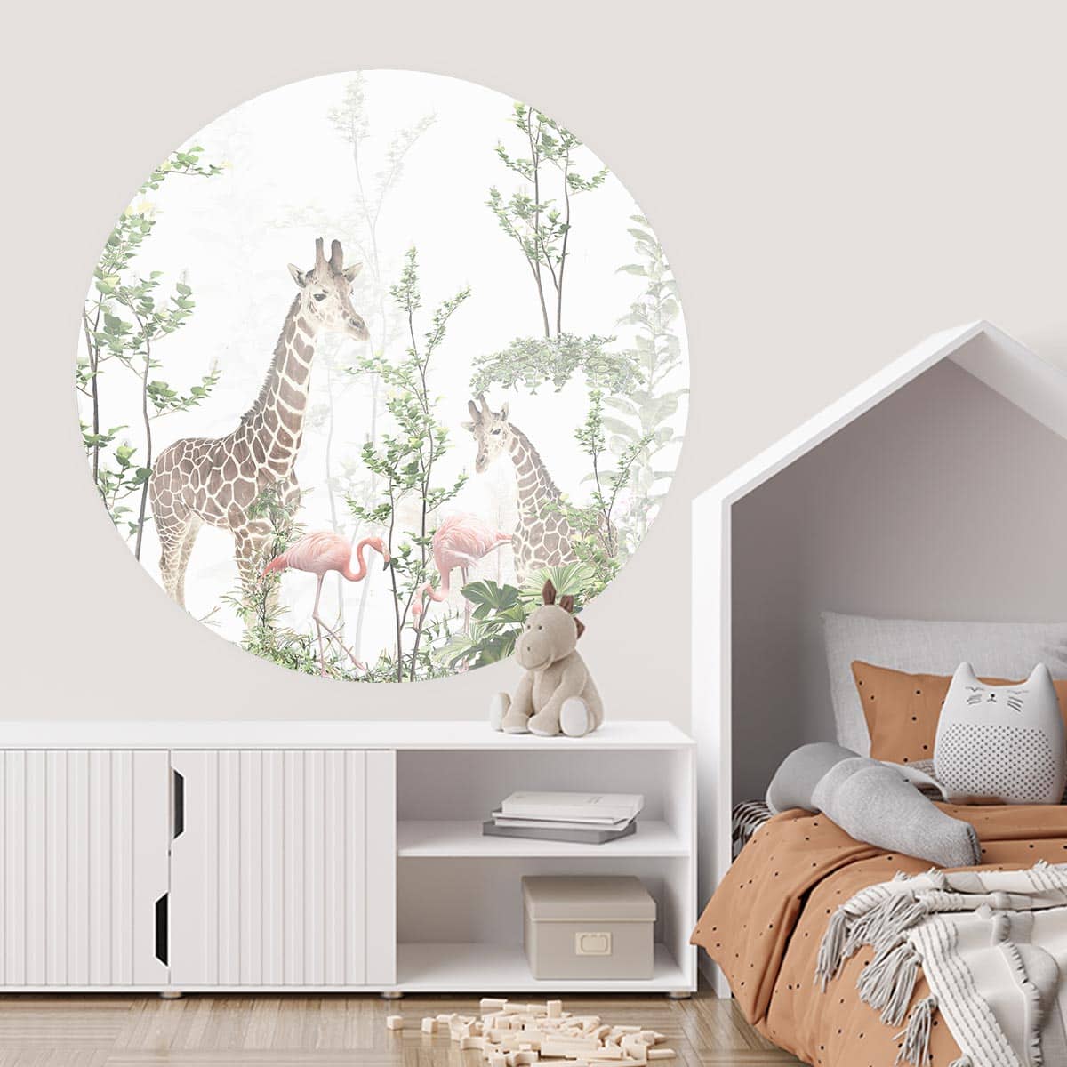 Kom tot rust in deze groene oase met olifanten, flamingo’s en giraffen… Deze dieren behangcirkel past perfect in een rustige kinderkamer.