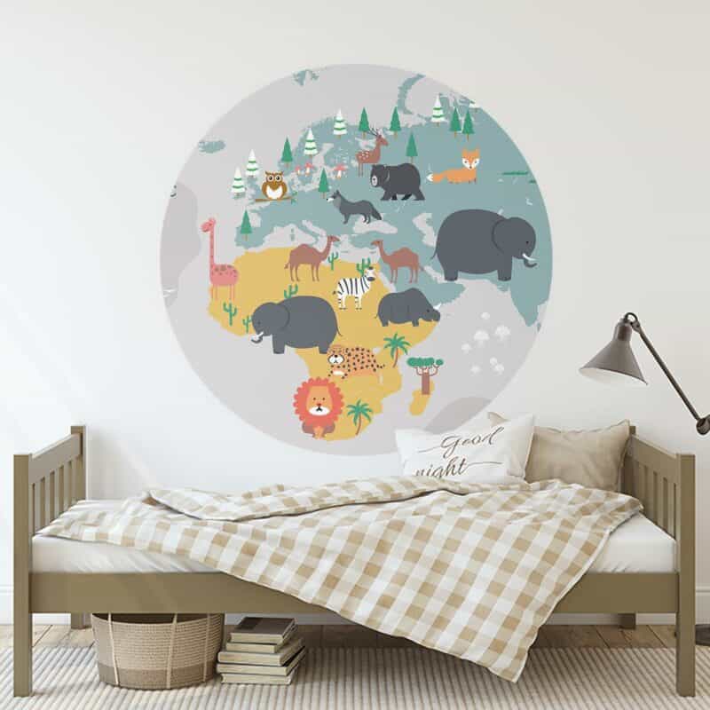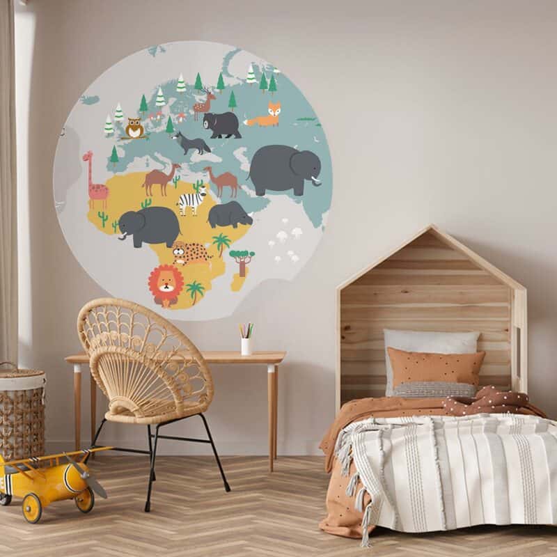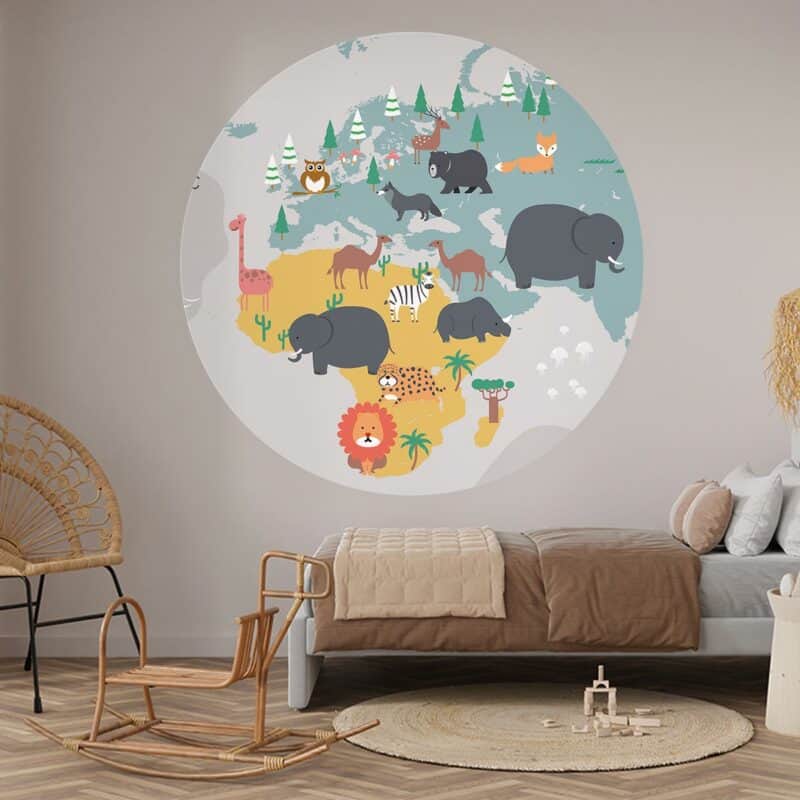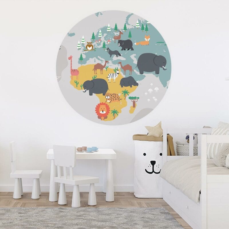 Met een behangcirkel (ook wel ronde muursticker genoemd) geef je de kinderkamer, babykamer, speelkamer of andere ruimte direct een nieuw en fris uiterlijk! Behangcirkel ‘Dieren wereldkaart’ wordt op een kwalitatief hoog materiaal geprint, waardoor het design en kleuren goed tot zijn recht komen. Ook zijn onze behangcirkels weer gemakkelijk te verwijderen, zonder lijmresten achter te laten op de muur.