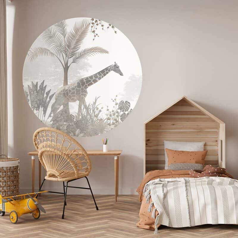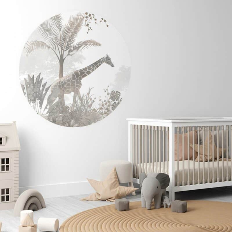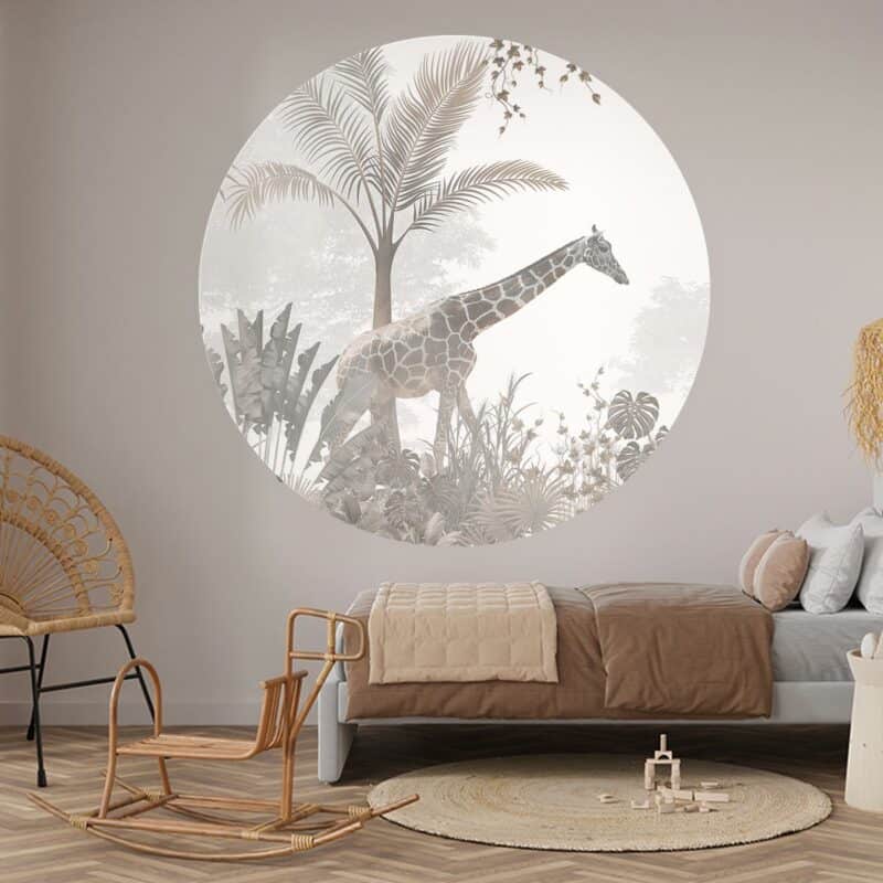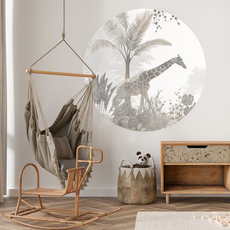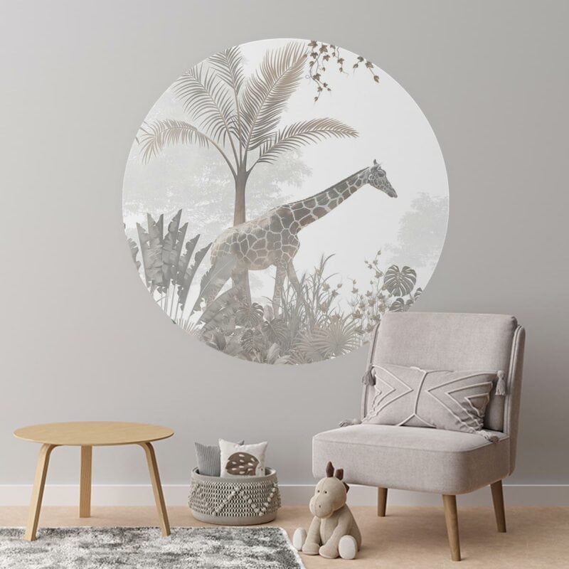 Op deze jungle behangcirkel zie je maar liefst twee grote giraffen! De grijze tint met vleugje beige zorgen voor een rustig en chic geheel.