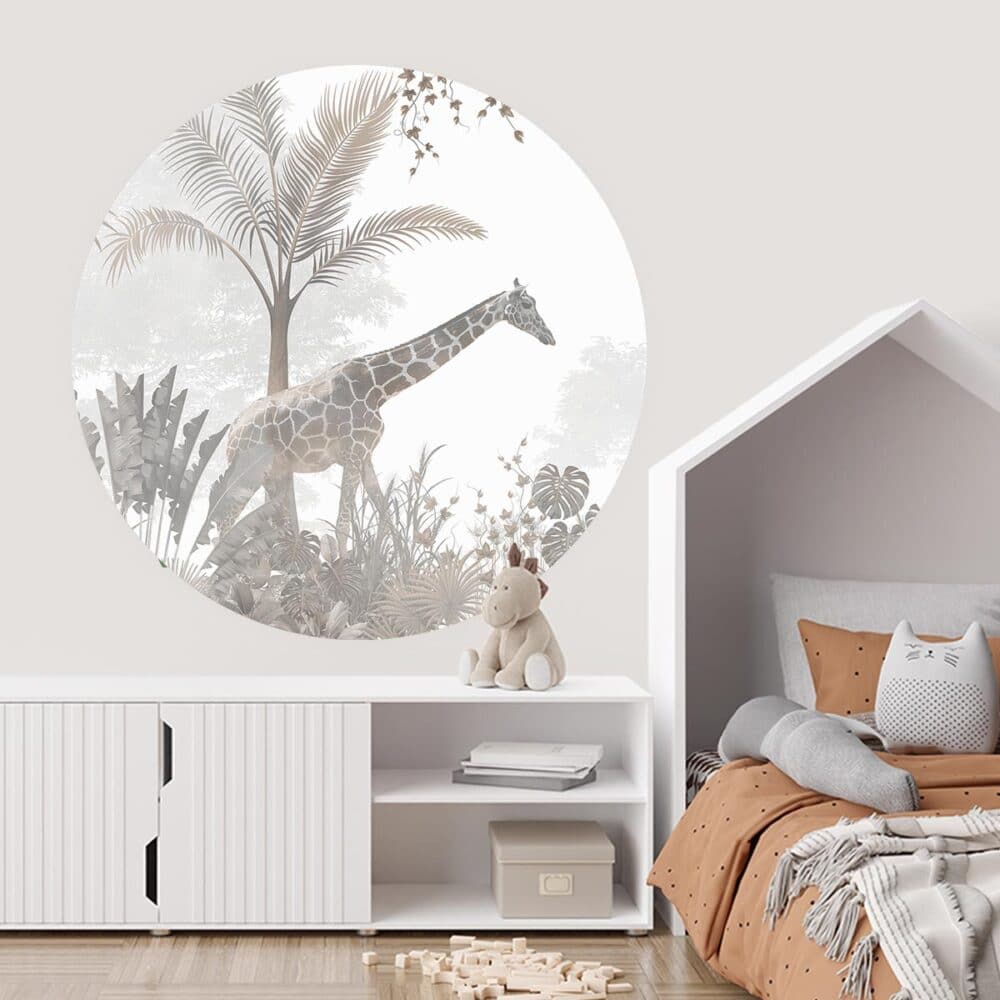 Op deze jungle behangcirkel zie je maar liefst twee grote giraffen! De grijze tint met vleugje beige zorgen voor een rustig en chic geheel.