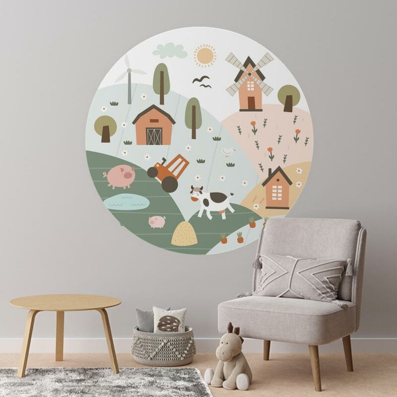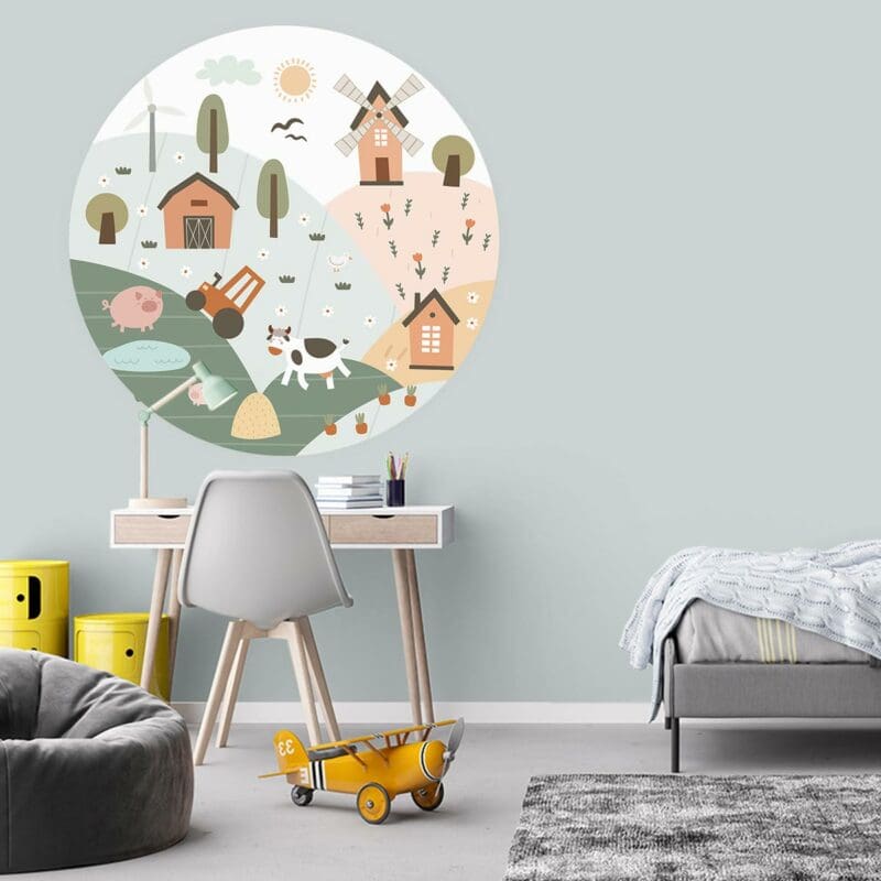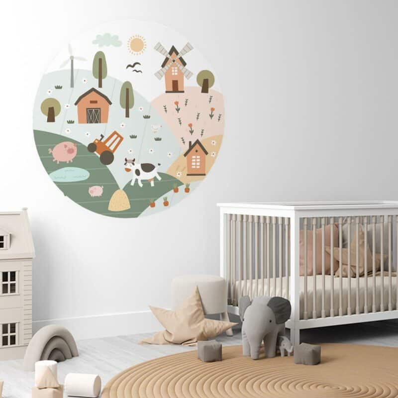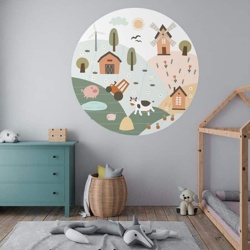 Hollandser dan op deze kleurrijke behangcirkel kan het niet! Van boerderijdieren tot aan tulpen… Geweldig voor een landelijke kinderkamer!