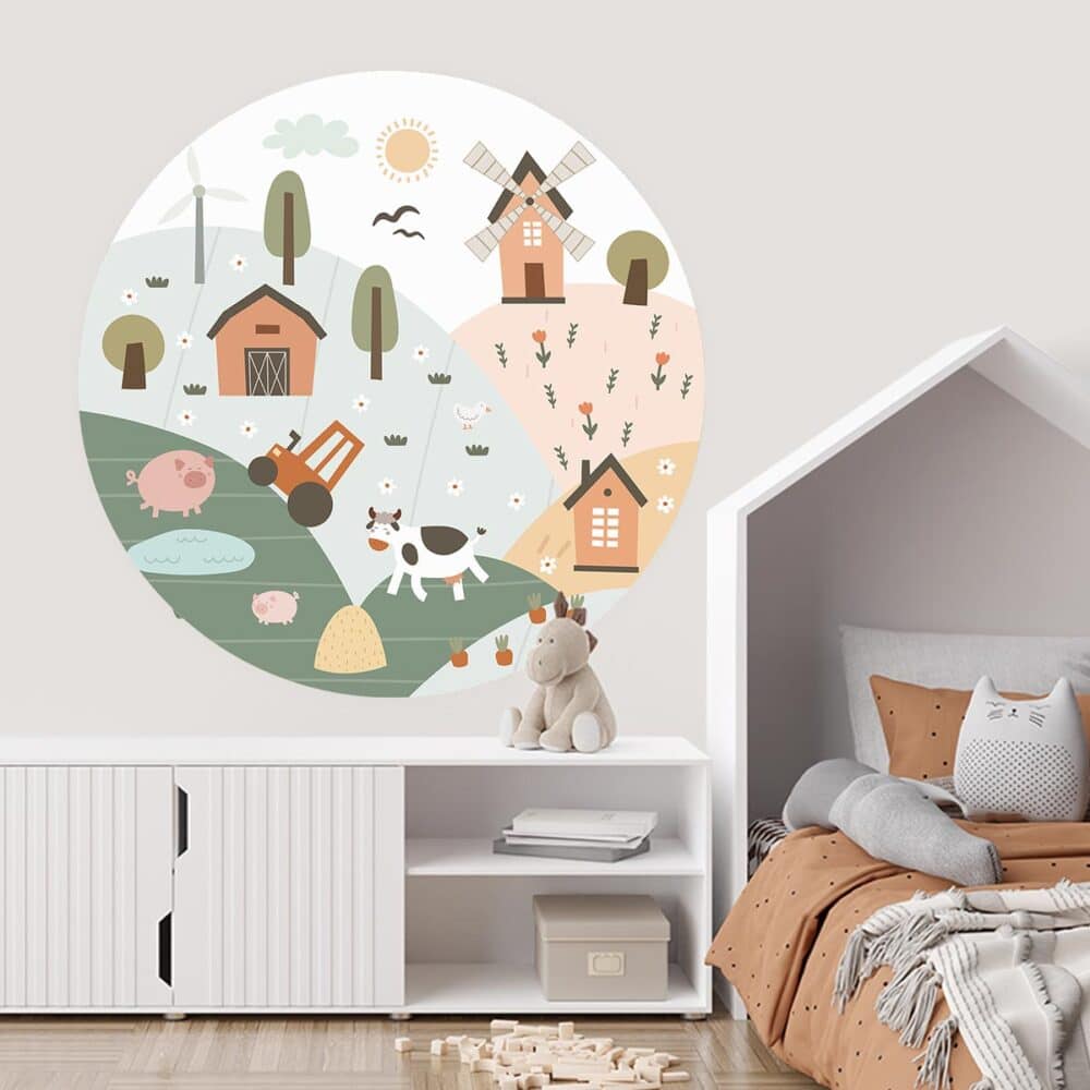 Hollandser dan op deze kleurrijke behangcirkel kan het niet! Van boerderijdieren tot aan tulpen… Geweldig voor een landelijke kinderkamer!