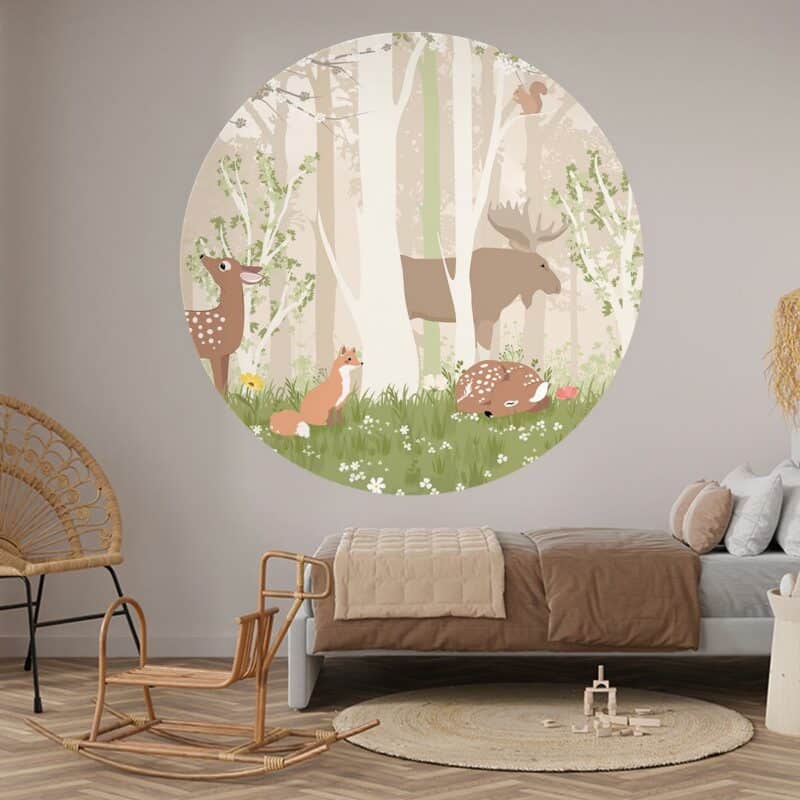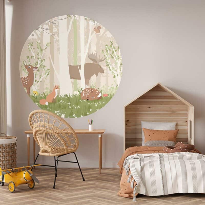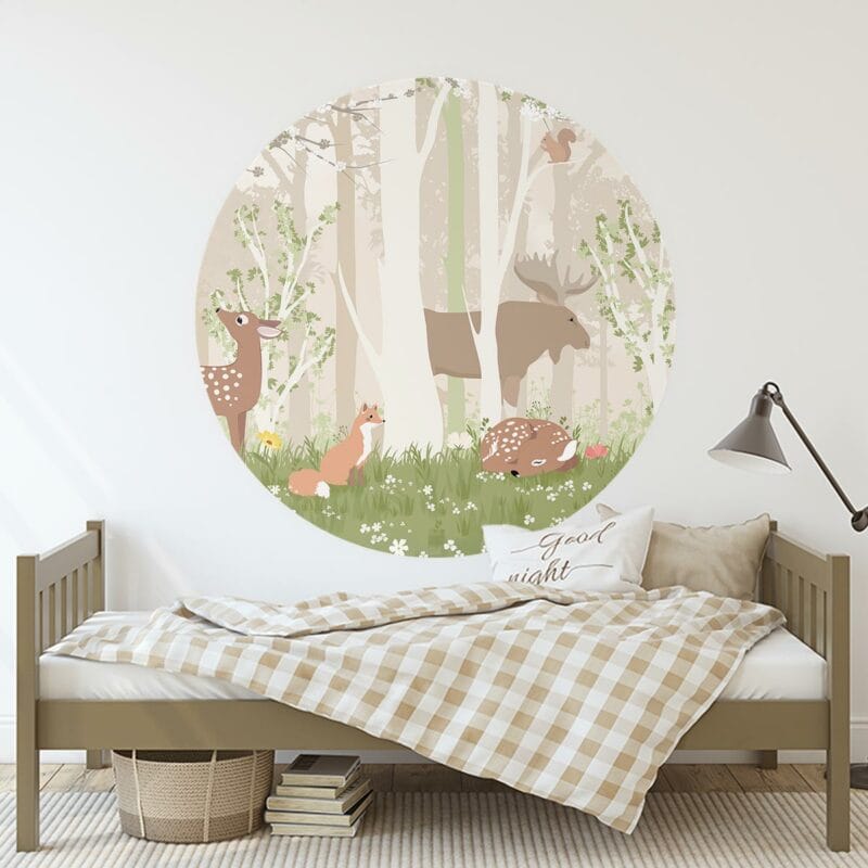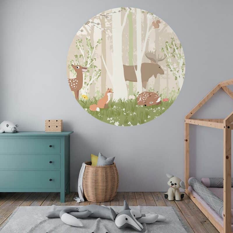 Heerlijk luieren in de bossen, dat kunnen de dieren op deze liefelijke behangcirkel wel… Luier jij op jouw kamertje met ze mee?