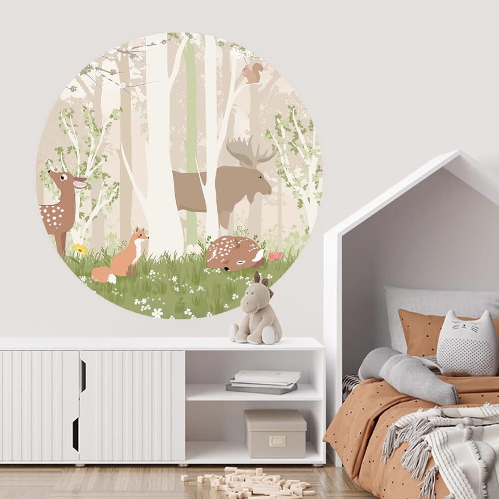 Heerlijk luieren in de bossen, dat kunnen de dieren op deze liefelijke behangcirkel wel… Luier jij op jouw kamertje met ze mee?