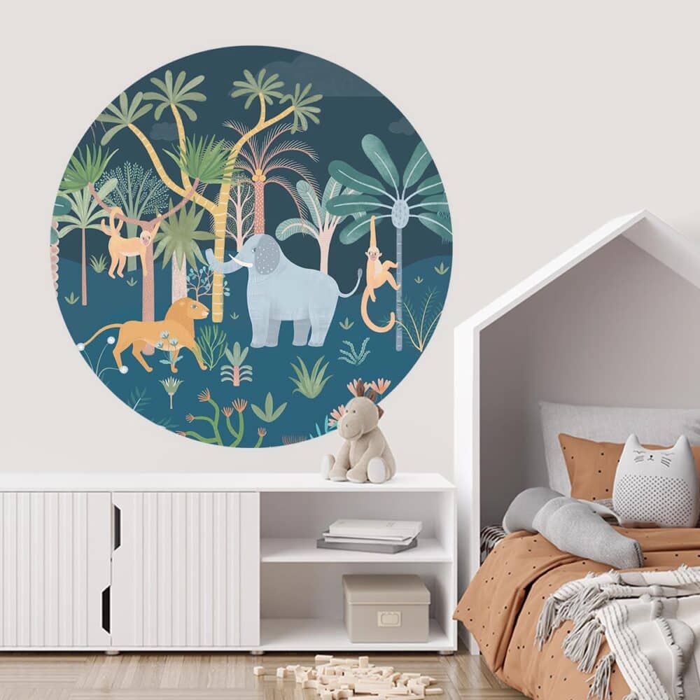 Dacht jij rustig te slapen op jouw kamer… niet met deze savanne behangcirkel! Juist ’s nachts houden deze vrolijke dieren jou gezelschap.