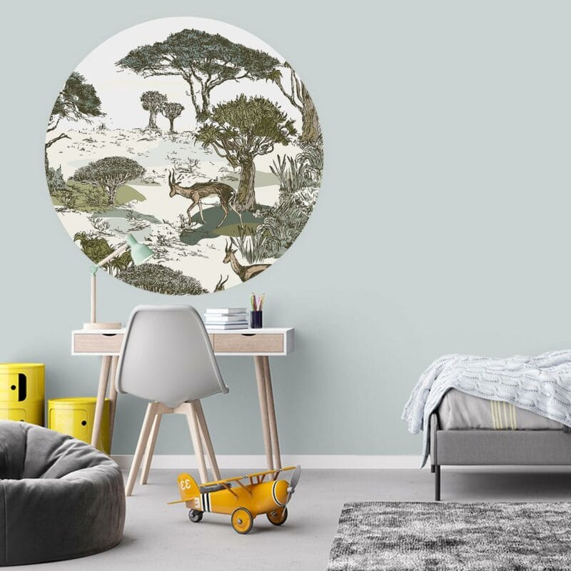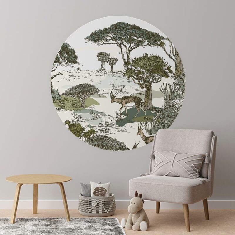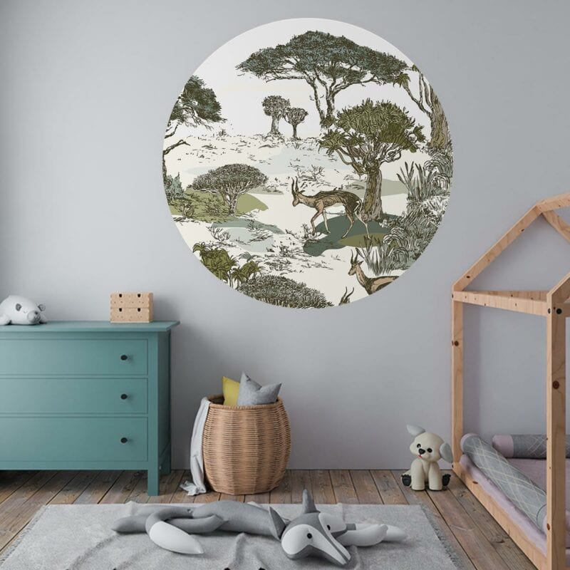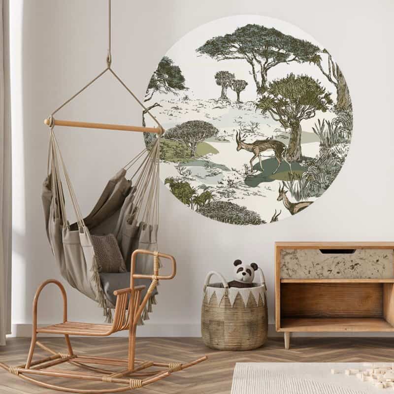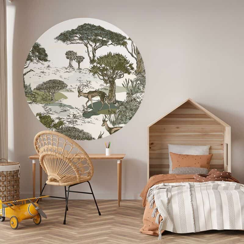 Met een behangcirkel (ook wel ronde muursticker genoemd) geef je de kinderkamer, babykamer, speelkamer of andere ruimte direct een nieuw en fris uiterlijk! Behangcirkel ‘Savanne landschap toile design’ wordt op een kwalitatief hoog materiaal geprint, waardoor het design en kleuren goed tot zijn recht komen. Ook zijn onze behangcirkels weer gemakkelijk te verwijderen, zonder lijmresten achter te laten op de muur.