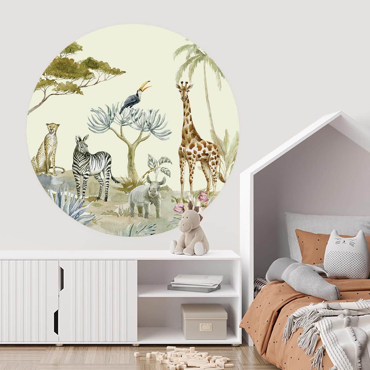 Met een behangcirkel (ook wel ronde muursticker genoemd) geef je de kinderkamer, babykamer, speelkamer of andere ruimte direct een nieuw en fris uiterlijk! Behangcirkel ‘Savannedieren tussen de bomen’ wordt op een kwalitatief hoog materiaal geprint, waardoor het design en kleuren goed tot zijn recht komen. Ook zijn onze behangcirkels weer gemakkelijk te verwijderen, zonder lijmresten achter te laten op de muur.