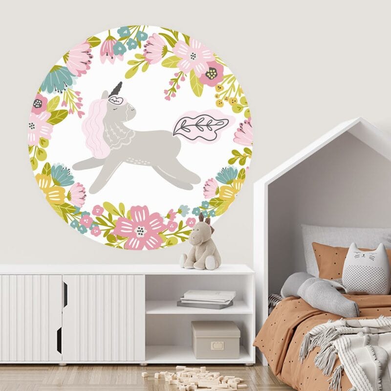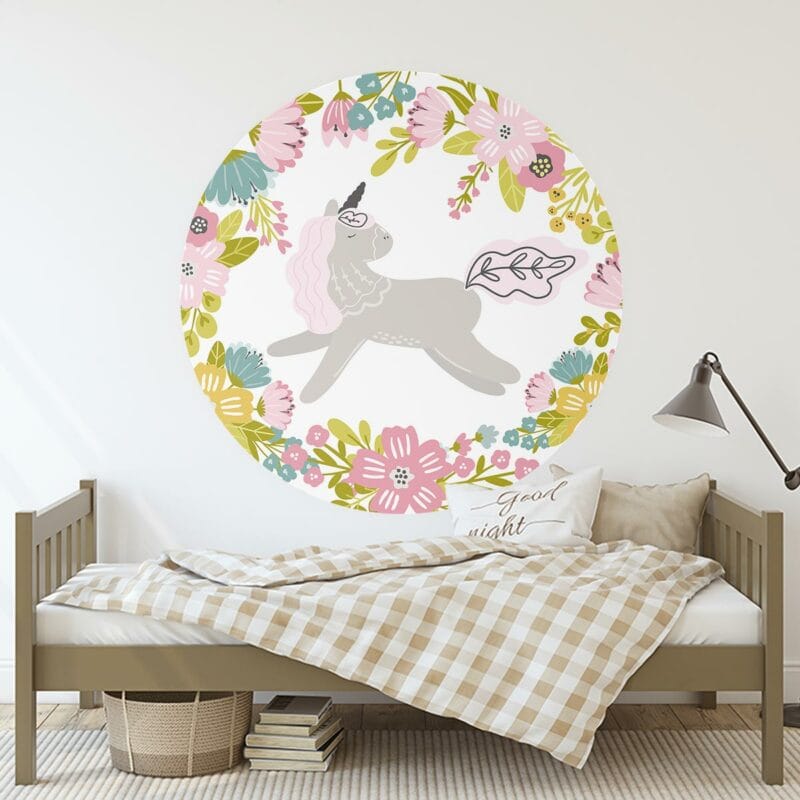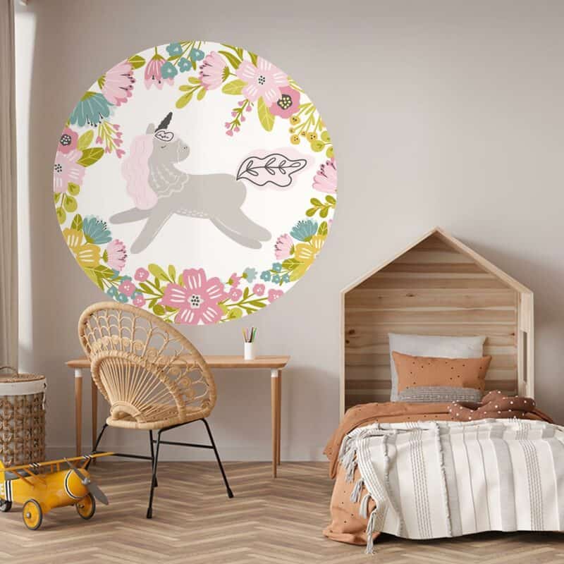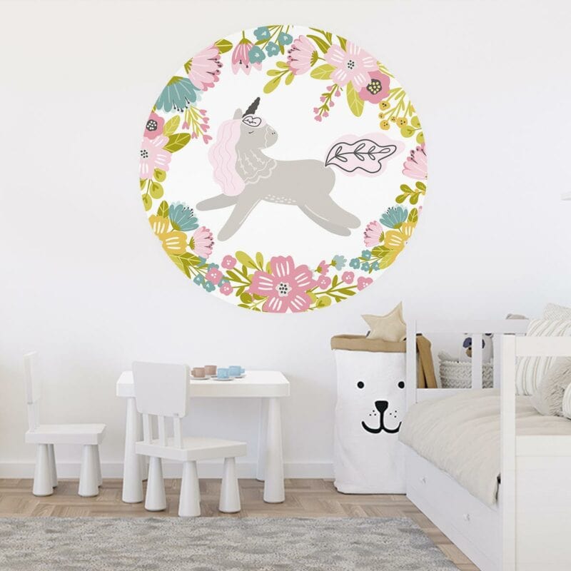 Met een behangcirkel (ook wel ronde muursticker genoemd) geef je de kinderkamer, babykamer, speelkamer of andere ruimte direct een nieuw en fris uiterlijk! Behangcirkel ‘Unicorn met bloemetjes’ wordt op een kwalitatief hoog materiaal geprint, waardoor het design en kleuren goed tot zijn recht komen. Ook zijn onze behangcirkels weer gemakkelijk te verwijderen, zonder lijmresten achter te laten op de muur.