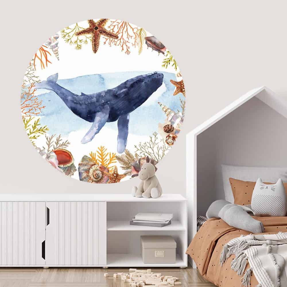 Met een behangcirkel (ook wel ronde muursticker genoemd) geef je de kinderkamer, babykamer, speelkamer of andere ruimte direct een nieuw en fris uiterlijk! Behangcirkel ‘Walvis koninkrijk’ wordt op een kwalitatief hoog materiaal geprint, waardoor het design en kleuren goed tot zijn recht komen. Ook zijn onze behangcirkels weer gemakkelijk te verwijderen, zonder lijmresten achter te laten op de muur.