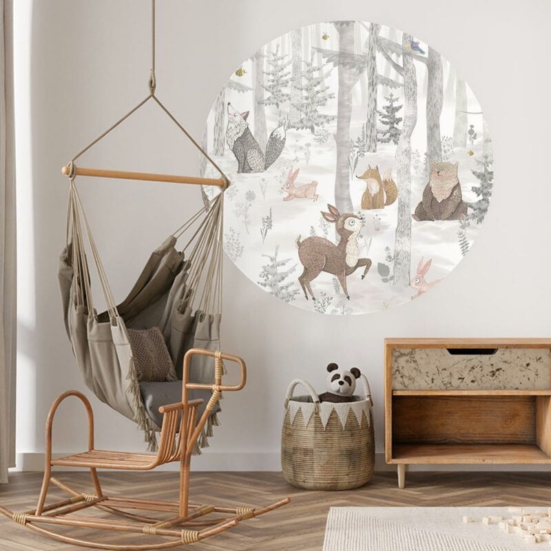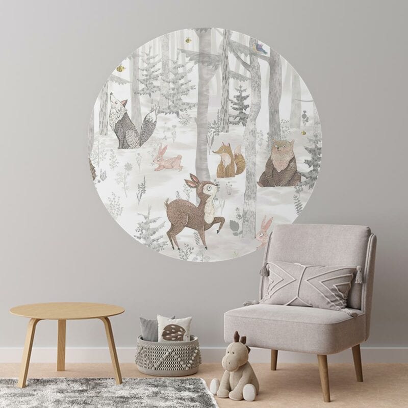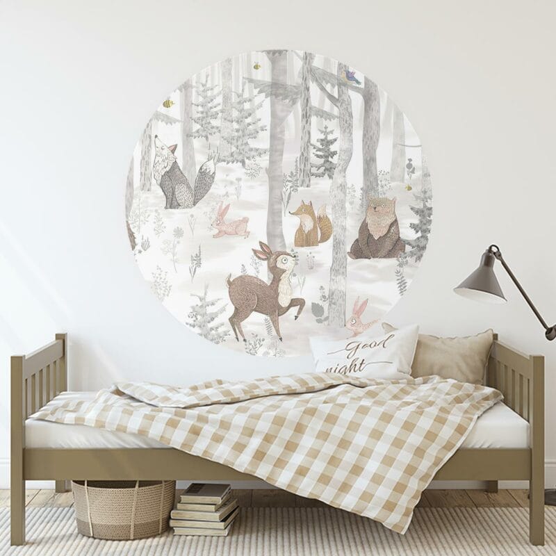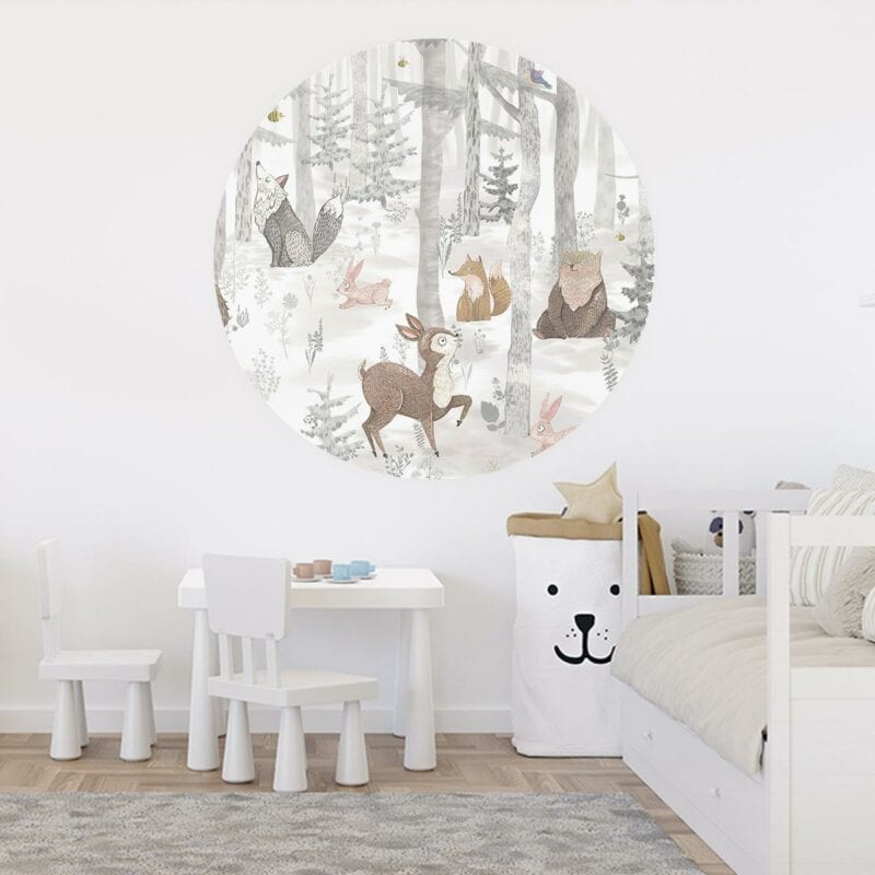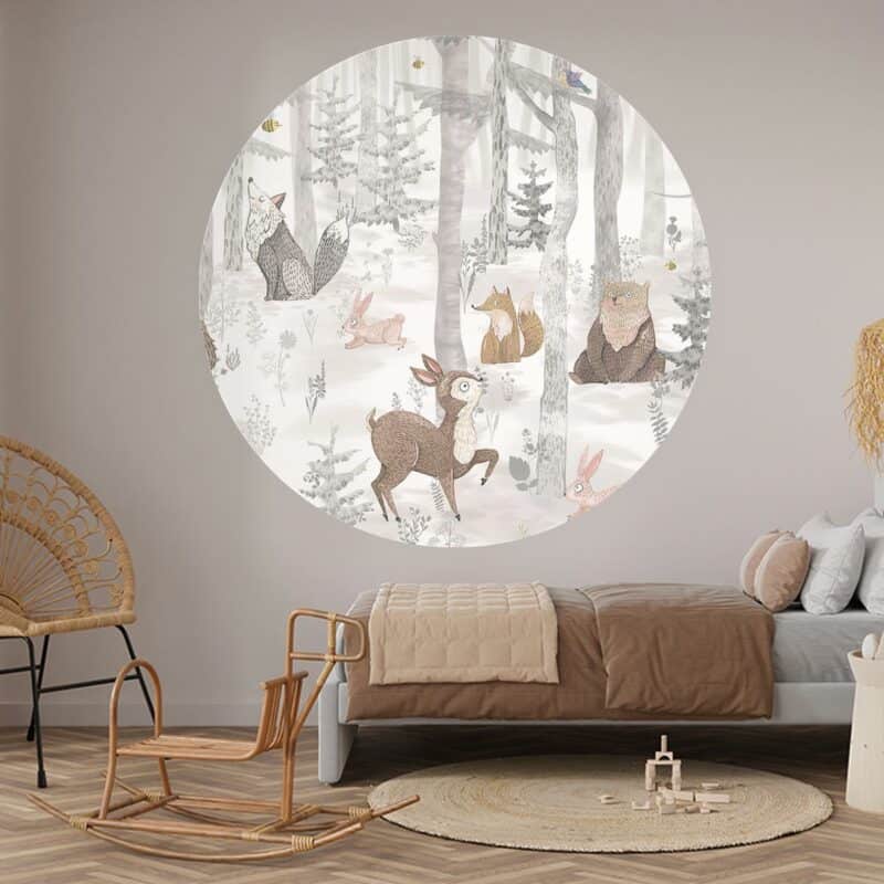 Een winter wonderland vol met bosdieren… Deze lieve behangcirkel met witte, bruine en grijze tinten past op iedere kinderkamer!