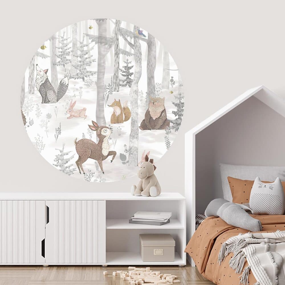 Een winter wonderland vol met bosdieren… Deze lieve behangcirkel met witte, bruine en grijze tinten past op iedere kinderkamer!