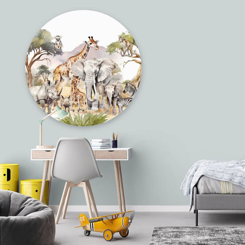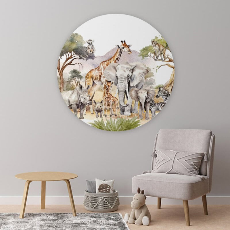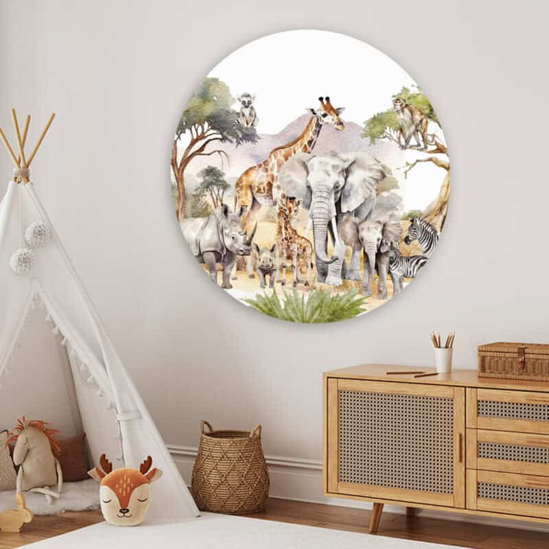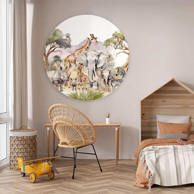 Onze prachtige ronde kunstwerken geven stijl aan elke kinderkamer, babykamer of speelkamer. In een handomdraai tover je de kamer om tot een fijne plek! Muurcirkel ‘Afrikaanse dierenfamilie op de savanne’ wordt op een licht materiaal geproduceerd, heeft een uitstekende kleurweergave en een lichte structuur. Hierdoor krijgt de wandcirkel een stoere look.