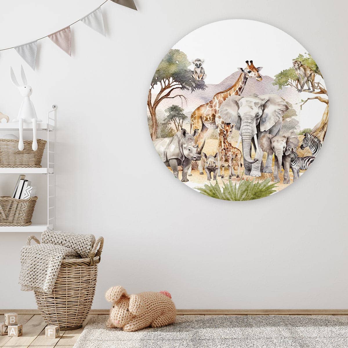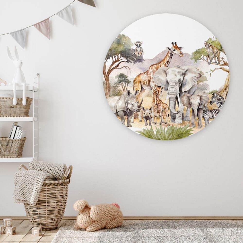 Onze prachtige ronde kunstwerken geven stijl aan elke kinderkamer, babykamer of speelkamer. In een handomdraai tover je de kamer om tot een fijne plek! Muurcirkel ‘Afrikaanse dierenfamilie op de savanne’ wordt op een licht materiaal geproduceerd, heeft een uitstekende kleurweergave en een lichte structuur. Hierdoor krijgt de wandcirkel een stoere look.