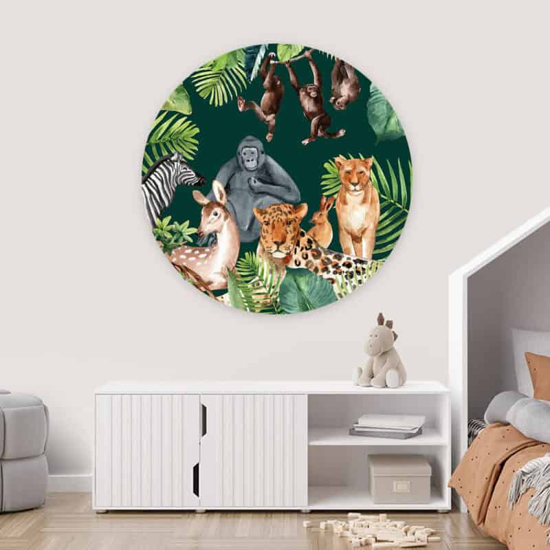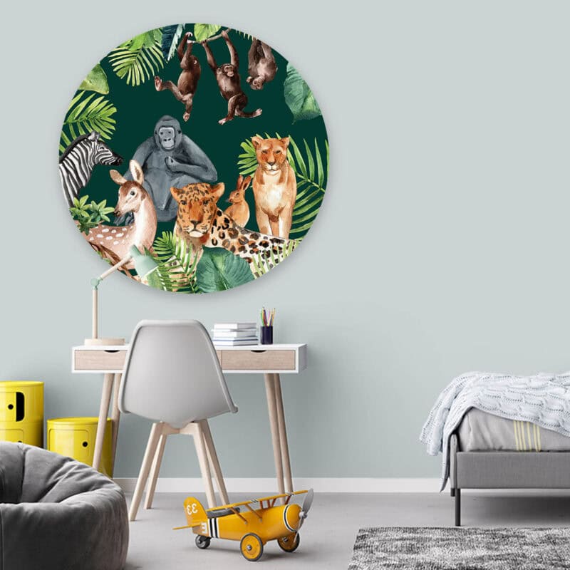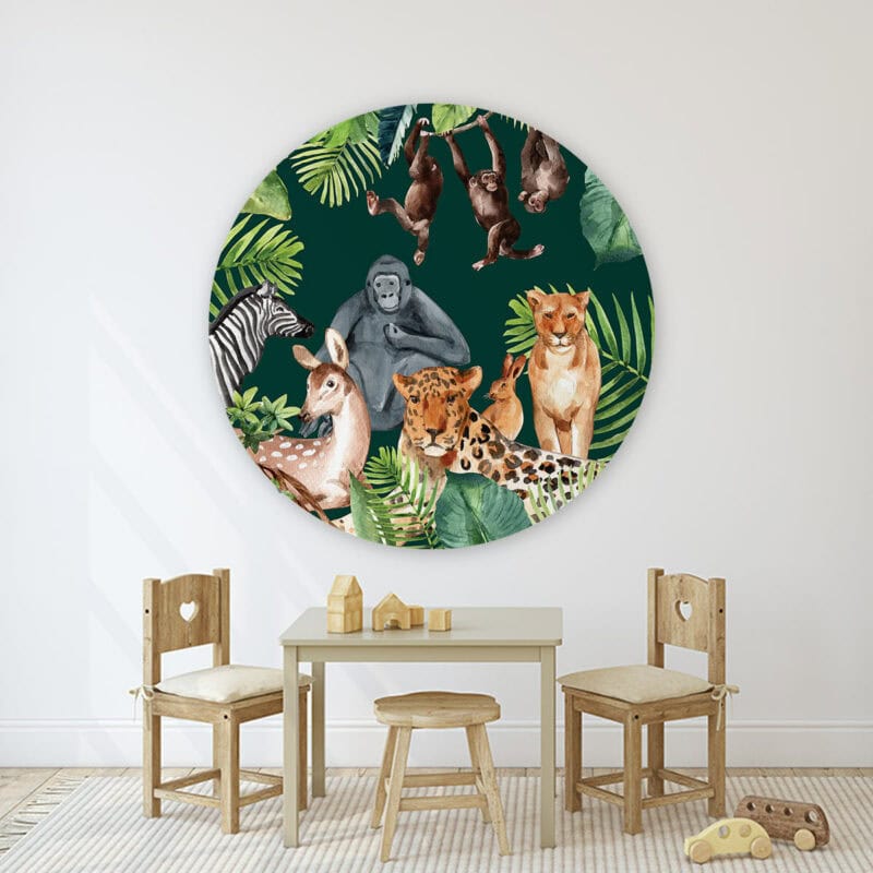 Alle dieren verzamelen! Van leeuw tot aan hert en van gorilla tot aan konijn: jungle meets forest in deze groene muurcirkel.
