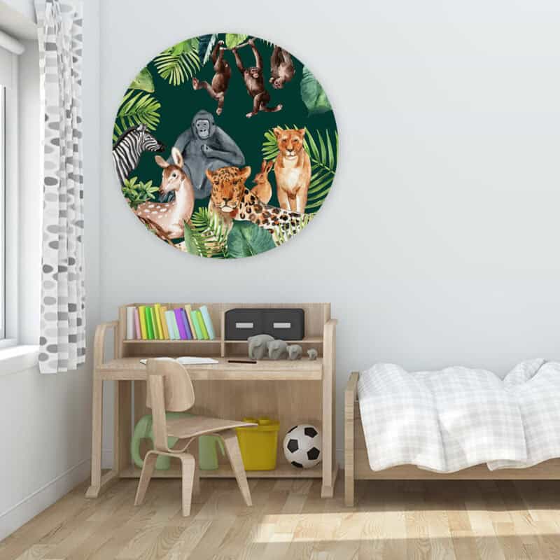 Onze prachtige ronde kunstwerken geven stijl aan elke kinderkamer, babykamer of speelkamer. In een handomdraai tover je de kamer om tot een fijne plek! Muurcirkel ‘Alle dieren op een rij’ wordt op een licht materiaal geproduceerd, heeft een uitstekende kleurweergave en een lichte structuur. Hierdoor krijgt de wandcirkel een stoere look.