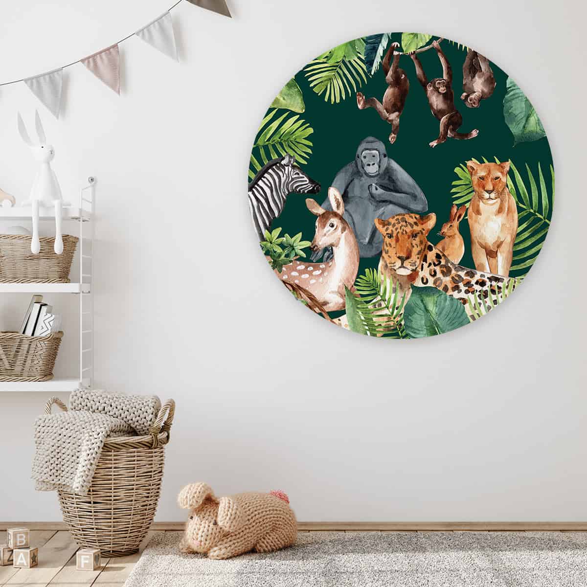 Alle dieren verzamelen! Van leeuw tot aan hert en van gorilla tot aan konijn: jungle meets forest in deze groene muurcirkel.