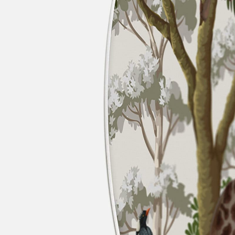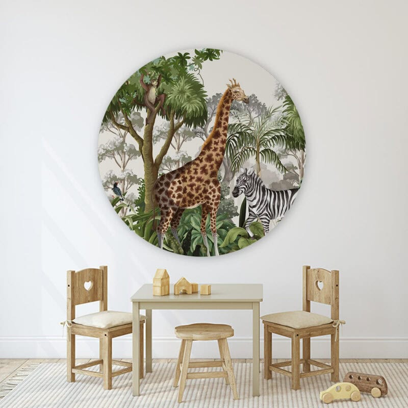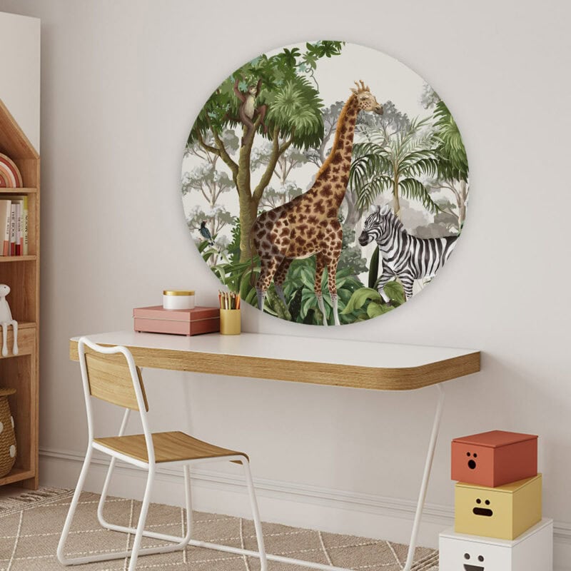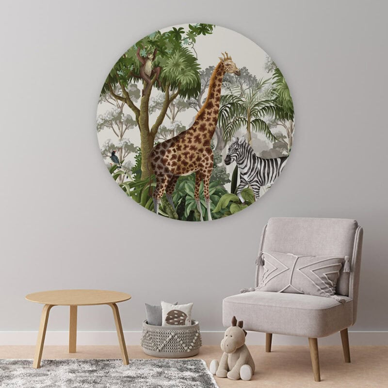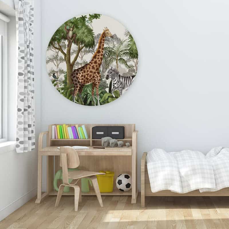 Onze prachtige ronde kunstwerken geven stijl aan elke kinderkamer, babykamer of speelkamer. In een handomdraai tover je de kamer om tot een fijne plek! Muurcirkel ‘Giraf en zebra in de jungle’ wordt op een licht materiaal geproduceerd, heeft een uitstekende kleurweergave en een lichte structuur. Hierdoor krijgt de wandcirkel een stoere look.
