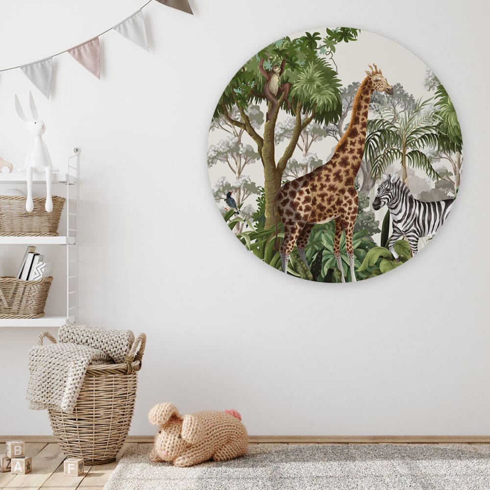 Onze prachtige ronde kunstwerken geven stijl aan elke kinderkamer, babykamer of speelkamer. In een handomdraai tover je de kamer om tot een fijne plek! Muurcirkel ‘Giraf en zebra in de jungle’ wordt op een licht materiaal geproduceerd, heeft een uitstekende kleurweergave en een lichte structuur. Hierdoor krijgt de wandcirkel een stoere look.