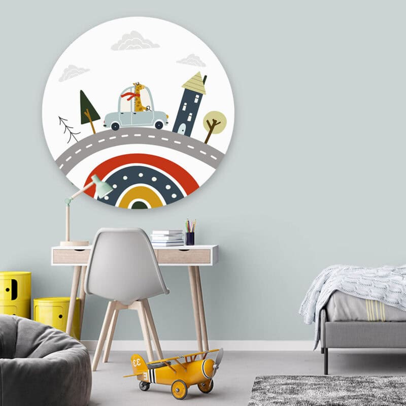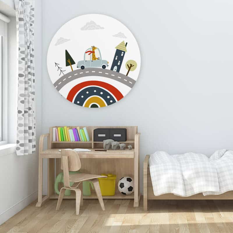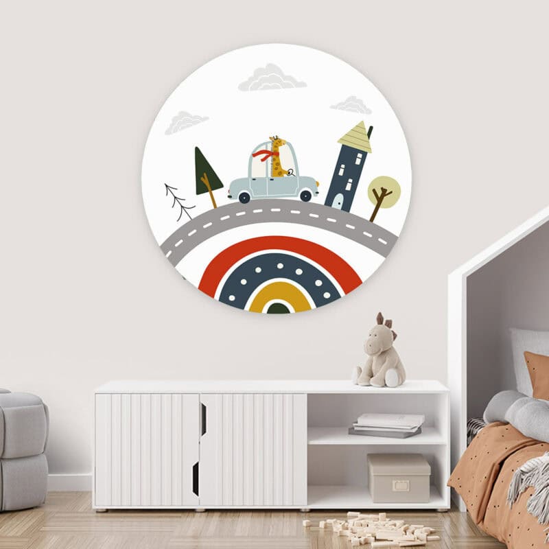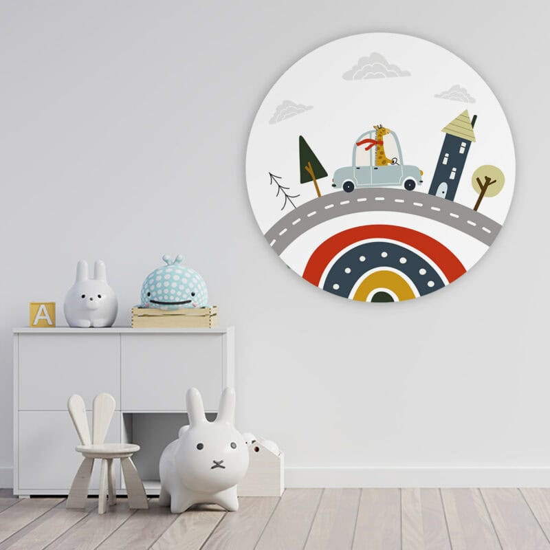Onze prachtige ronde kunstwerken geven stijl aan elke kinderkamer, babykamer of speelkamer. In een handomdraai tover je de kamer om tot een fijne plek! Muurcirkel ‘Giraffe in de auto’ wordt op een licht materiaal geproduceerd, heeft een uitstekende kleurweergave en een lichte structuur. Hierdoor krijgt de wandcirkel een stoere look.