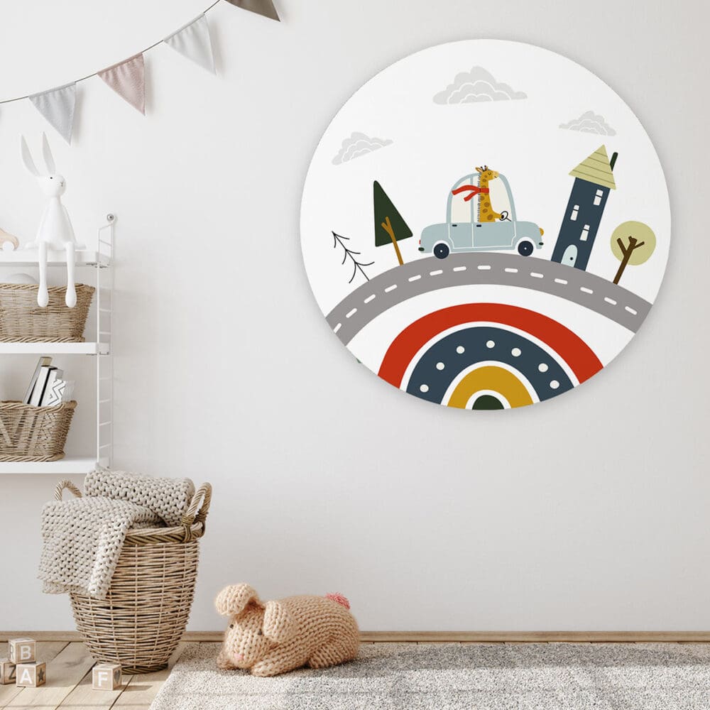 Onze prachtige ronde kunstwerken geven stijl aan elke kinderkamer, babykamer of speelkamer. In een handomdraai tover je de kamer om tot een fijne plek! Muurcirkel ‘Giraffe in de auto’ wordt op een licht materiaal geproduceerd, heeft een uitstekende kleurweergave en een lichte structuur. Hierdoor krijgt de wandcirkel een stoere look.