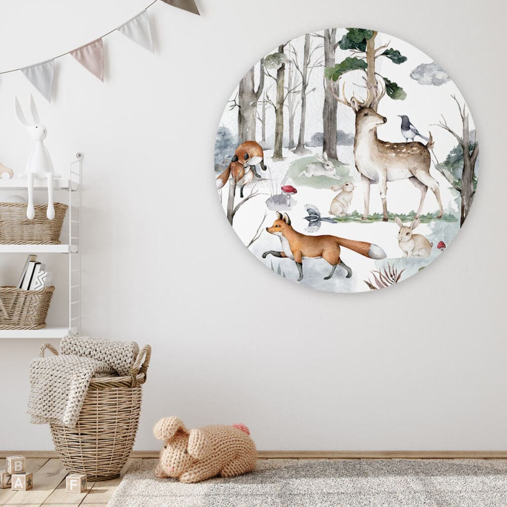 Onze prachtige ronde kunstwerken geven stijl aan elke kinderkamer, babykamer of speelkamer. In een handomdraai tover je de kamer om tot een fijne plek! Muurcirkel ‘Herfst in het bos’ wordt op een licht materiaal geproduceerd, heeft een uitstekende kleurweergave en een lichte structuur. Hierdoor krijgt de wandcirkel een stoere look.