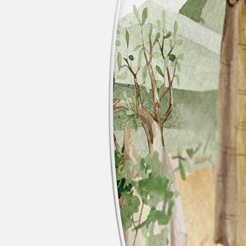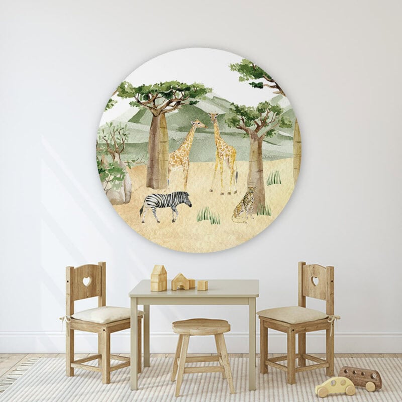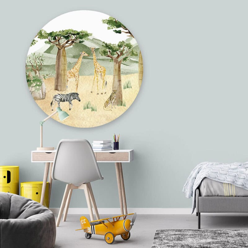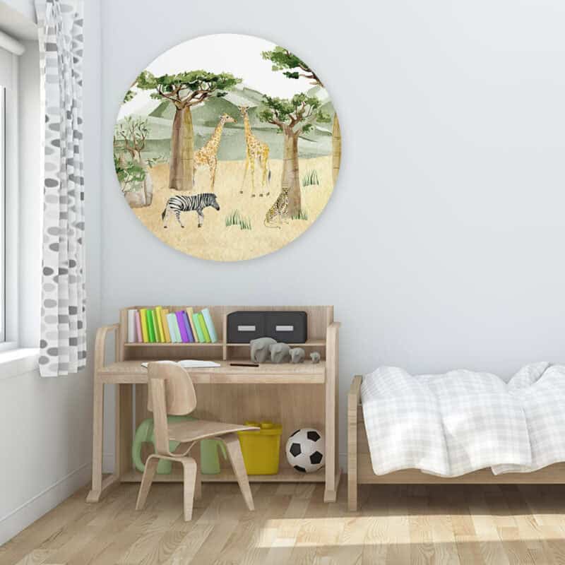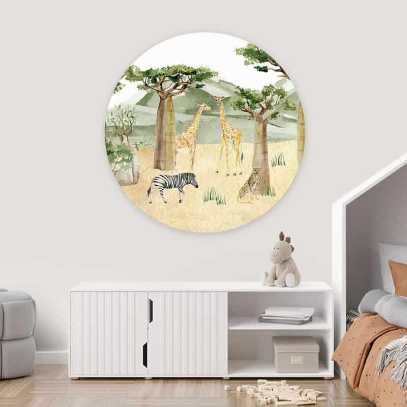 Onze prachtige ronde kunstwerken geven stijl aan elke kinderkamer, babykamer of speelkamer. In een handomdraai tover je de kamer om tot een fijne plek! Muurcirkel ‘Hoge bomen op de savanne’ wordt op een licht materiaal geproduceerd, heeft een uitstekende kleurweergave en een lichte structuur. Hierdoor krijgt de wandcirkel een stoere look.