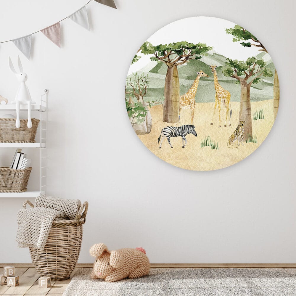 Onze prachtige ronde kunstwerken geven stijl aan elke kinderkamer, babykamer of speelkamer. In een handomdraai tover je de kamer om tot een fijne plek! Muurcirkel ‘Hoge bomen op de savanne’ wordt op een licht materiaal geproduceerd, heeft een uitstekende kleurweergave en een lichte structuur. Hierdoor krijgt de wandcirkel een stoere look.
