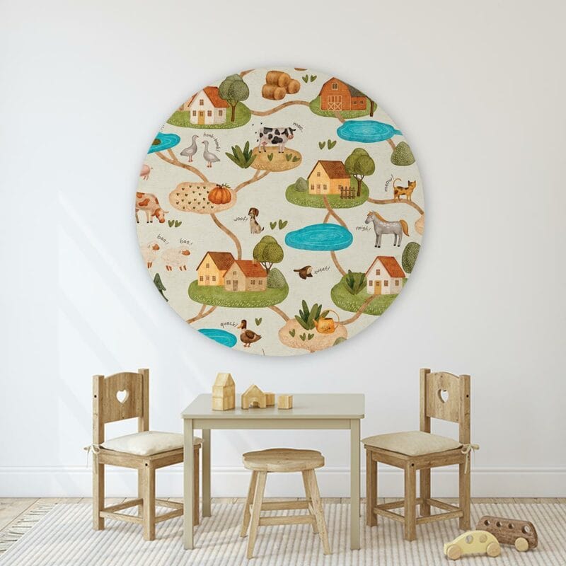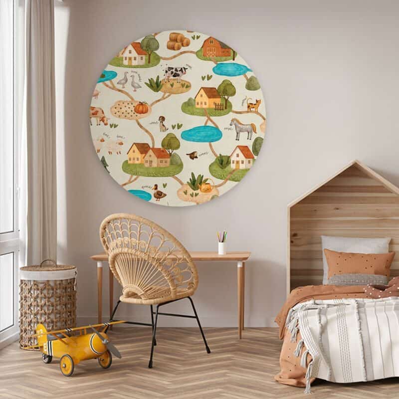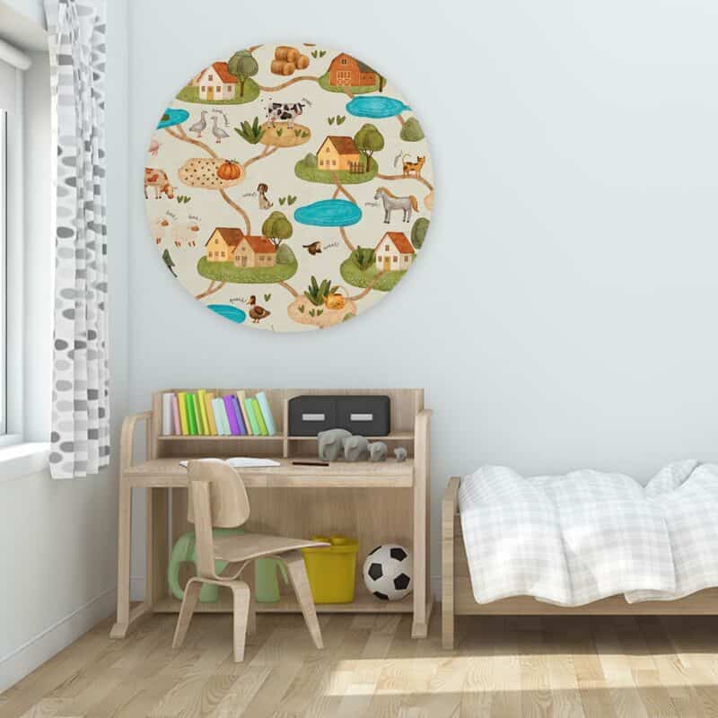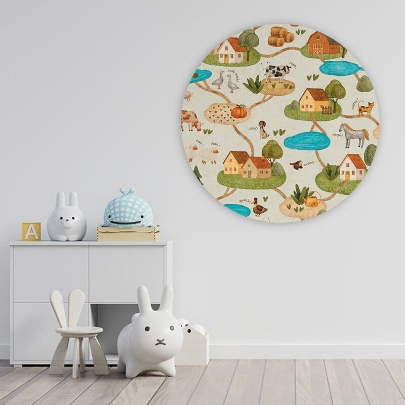 Onze prachtige ronde kunstwerken geven stijl aan elke kinderkamer, babykamer of speelkamer. In een handomdraai tover je de kamer om tot een fijne plek! Muurcirkel ‘Leven op de boerderij’ wordt op een licht materiaal geproduceerd, heeft een uitstekende kleurweergave en een lichte structuur. Hierdoor krijgt de wandcirkel een stoere look.