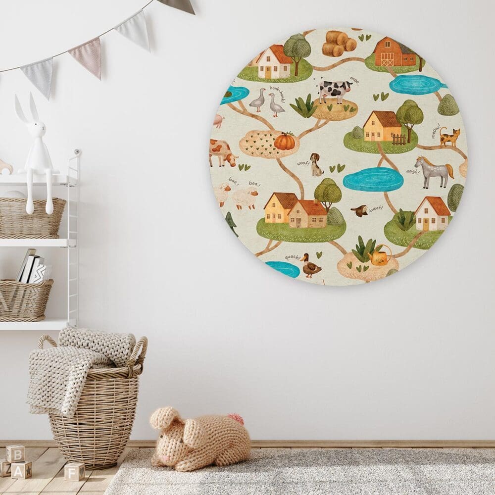 Onze prachtige ronde kunstwerken geven stijl aan elke kinderkamer, babykamer of speelkamer. In een handomdraai tover je de kamer om tot een fijne plek! Muurcirkel ‘Leven op de boerderij’ wordt op een licht materiaal geproduceerd, heeft een uitstekende kleurweergave en een lichte structuur. Hierdoor krijgt de wandcirkel een stoere look.