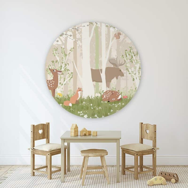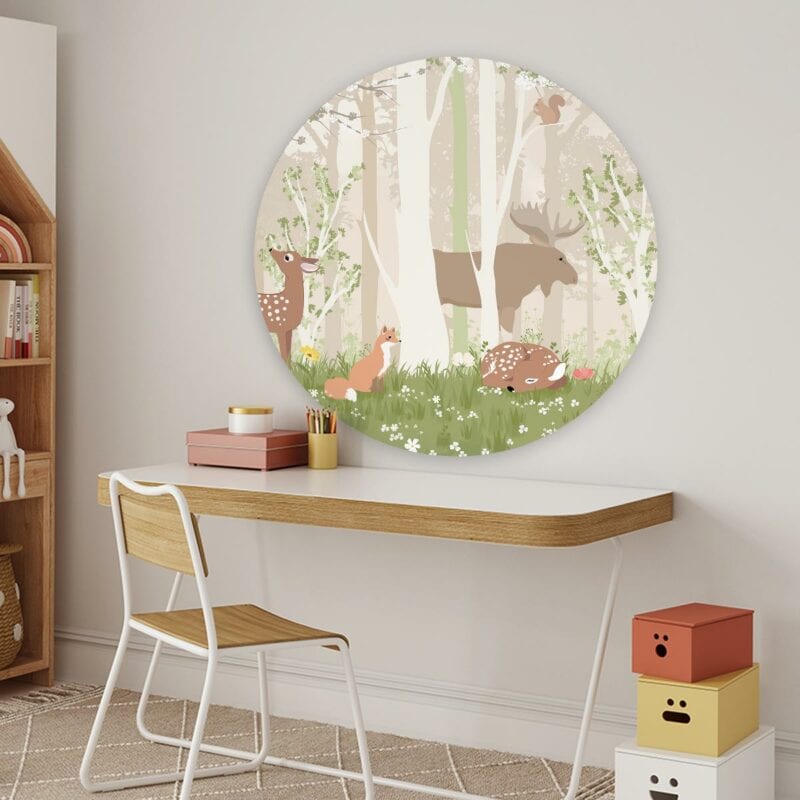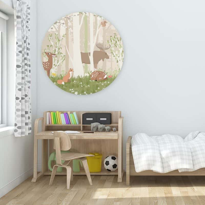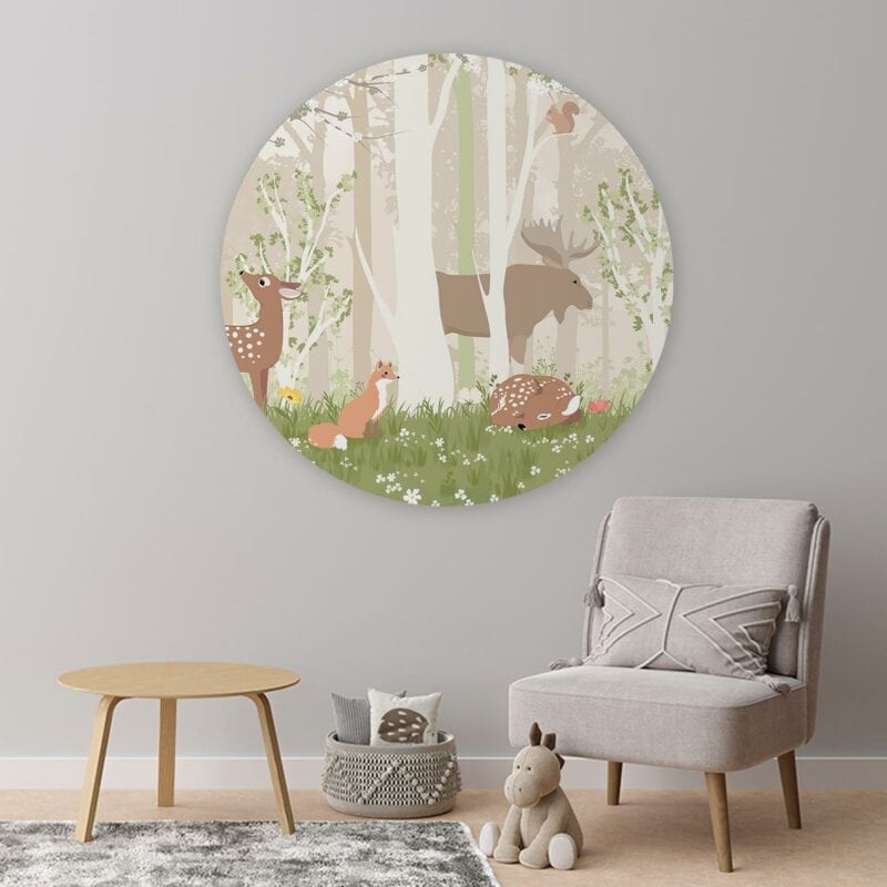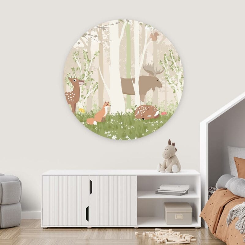 Onze prachtige ronde kunstwerken geven stijl aan elke kinderkamer, babykamer of speelkamer. In een handomdraai tover je de kamer om tot een fijne plek! Muurcirkel ‘Luieren in de bossen’ wordt op een licht materiaal geproduceerd, heeft een uitstekende kleurweergave en een lichte structuur. Hierdoor krijgt de wandcirkel een stoere look.