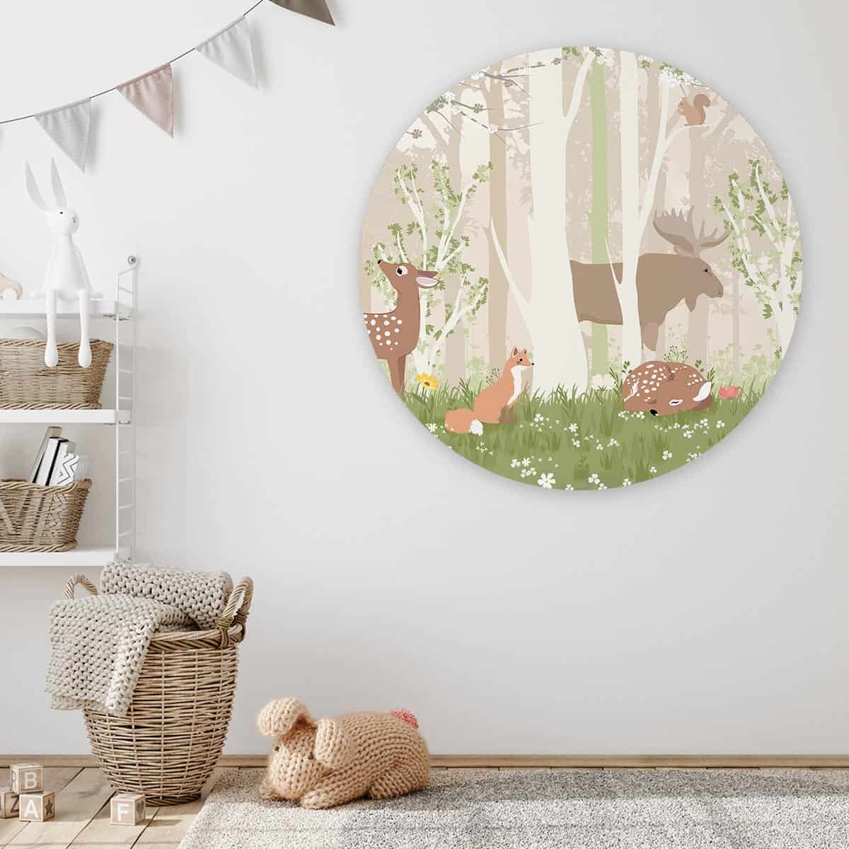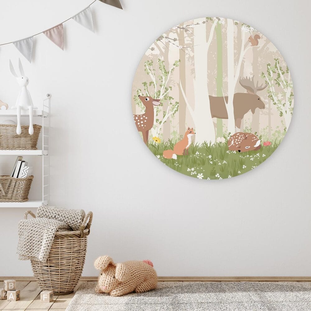 Onze prachtige ronde kunstwerken geven stijl aan elke kinderkamer, babykamer of speelkamer. In een handomdraai tover je de kamer om tot een fijne plek! Muurcirkel ‘Luieren in de bossen’ wordt op een licht materiaal geproduceerd, heeft een uitstekende kleurweergave en een lichte structuur. Hierdoor krijgt de wandcirkel een stoere look.