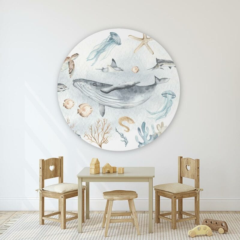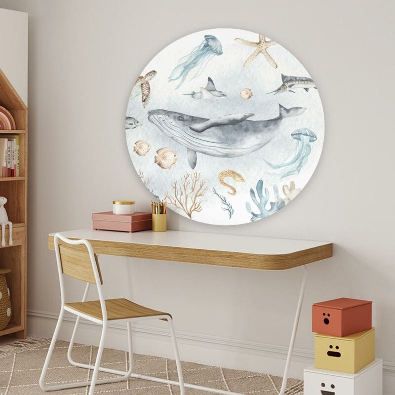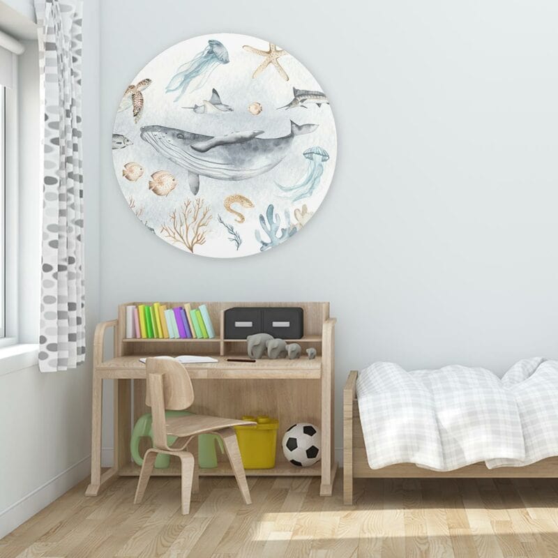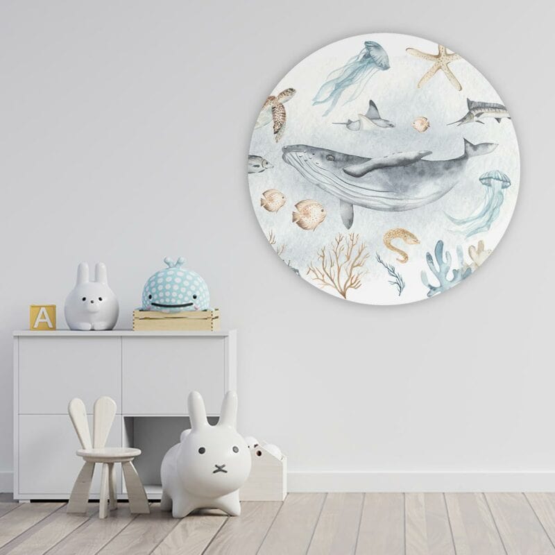 Onze prachtige ronde kunstwerken geven stijl aan elke kinderkamer, babykamer of speelkamer. In een handomdraai tover je de kamer om tot een fijne plek! Muurcirkel ‘Onderwater dierenrijk’ wordt op een licht materiaal geproduceerd, heeft een uitstekende kleurweergave en een lichte structuur. Hierdoor krijgt de wandcirkel een stoere look.