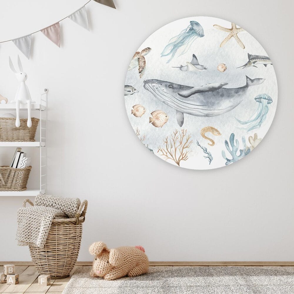 Onze prachtige ronde kunstwerken geven stijl aan elke kinderkamer, babykamer of speelkamer. In een handomdraai tover je de kamer om tot een fijne plek! Muurcirkel ‘Onderwater dierenrijk’ wordt op een licht materiaal geproduceerd, heeft een uitstekende kleurweergave en een lichte structuur. Hierdoor krijgt de wandcirkel een stoere look.