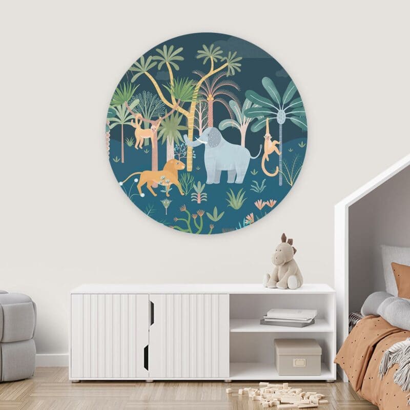Dacht jij rustig te slapen op jouw kamer… niet met deze savanne muurcirkel! Juist ’s nachts houden deze vrolijke dieren jou gezelschap.