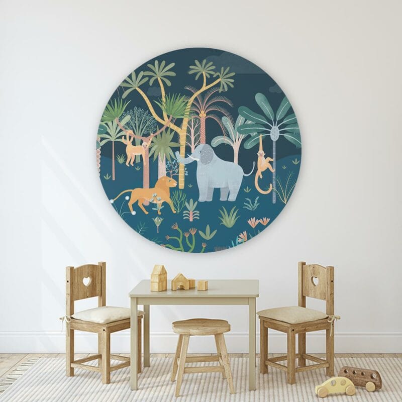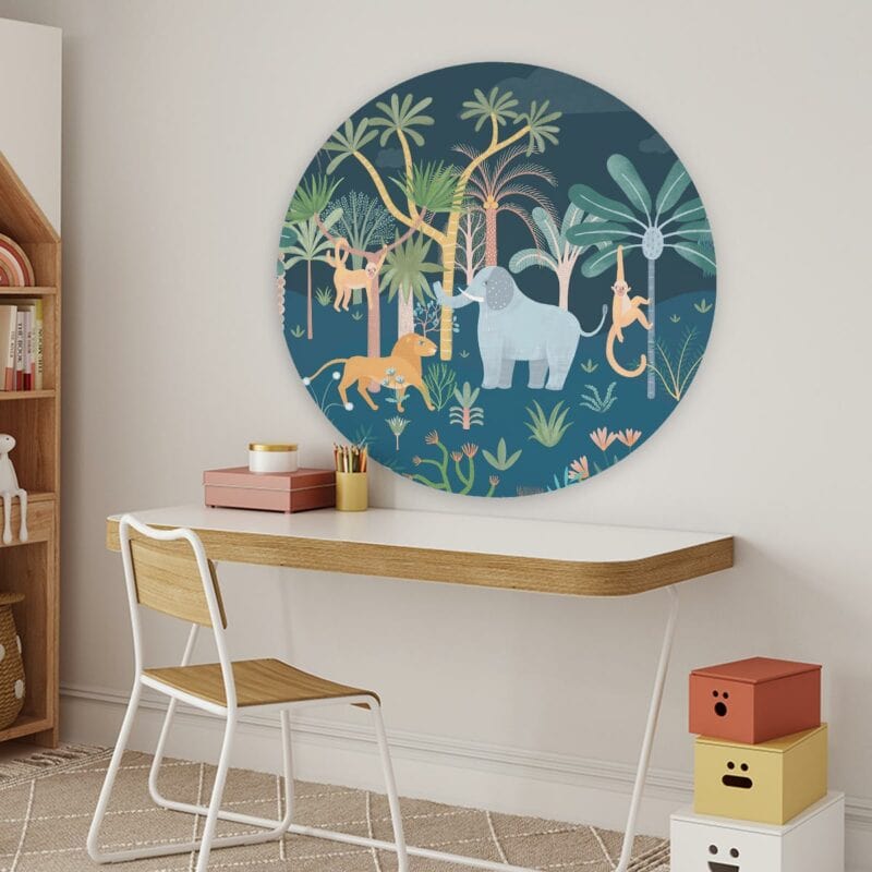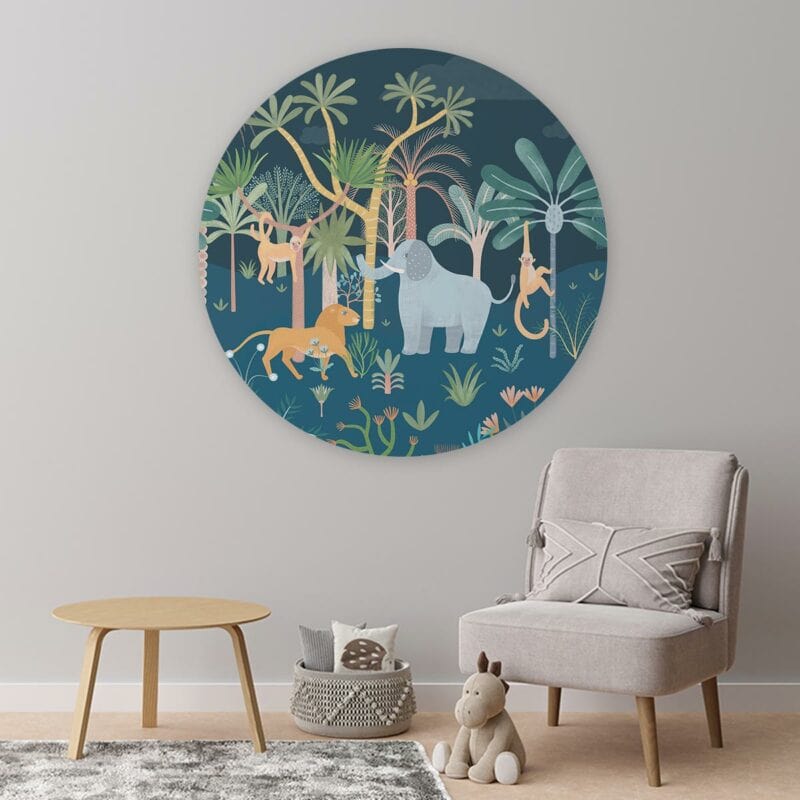 Onze prachtige ronde kunstwerken geven stijl aan elke kinderkamer, babykamer of speelkamer. In een handomdraai tover je de kamer om tot een fijne plek! Muurcirkel ‘Op de savanne bij nacht’ wordt op een licht materiaal geproduceerd, heeft een uitstekende kleurweergave en een lichte structuur. Hierdoor krijgt de wandcirkel een stoere look.