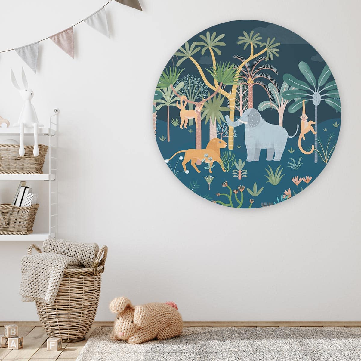 Onze prachtige ronde kunstwerken geven stijl aan elke kinderkamer, babykamer of speelkamer. In een handomdraai tover je de kamer om tot een fijne plek! Muurcirkel ‘Op de savanne bij nacht’ wordt op een licht materiaal geproduceerd, heeft een uitstekende kleurweergave en een lichte structuur. Hierdoor krijgt de wandcirkel een stoere look.
