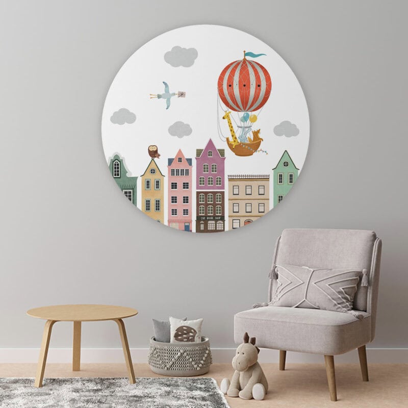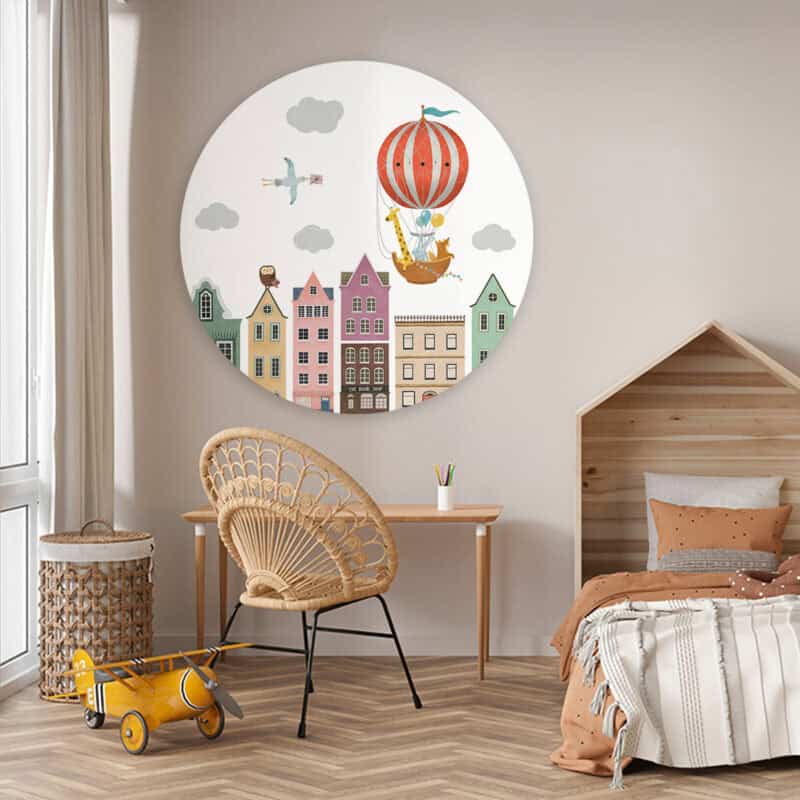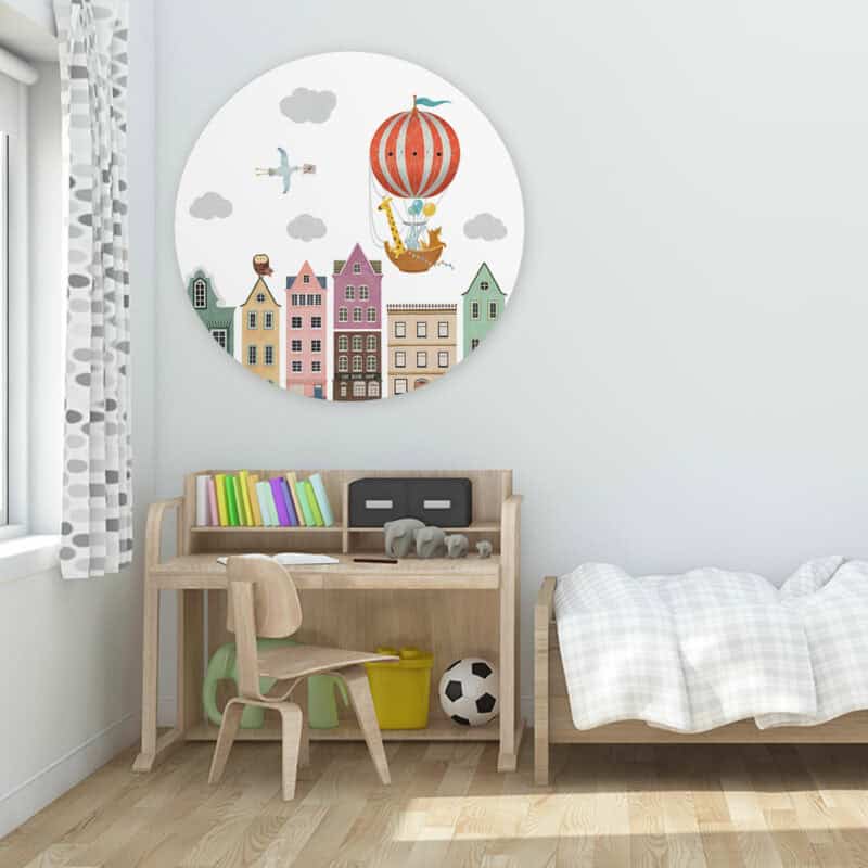 Onze prachtige ronde kunstwerken geven stijl aan elke kinderkamer, babykamer of speelkamer. In een handomdraai tover je de kamer om tot een fijne plek! Muurcirkel ‘Stad en luchtballonnen’ wordt op een licht materiaal geproduceerd, heeft een uitstekende kleurweergave en een lichte structuur. Hierdoor krijgt de wandcirkel een stoere look.