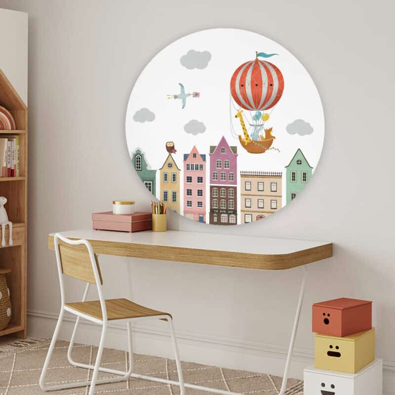 Dankzij het gratis meegeleverd ophangsysteem, hang je muurcirkel ‘Stad en luchtballonnen’ gemakkelijk en snel op. De mooie kleuren en stijl van de wandcirkel zal supermooi staan in de kamer van jouw kind of baby. En het is ook nog een erg leuk cadeau om te geven! Welke muurcirkel kies jij?