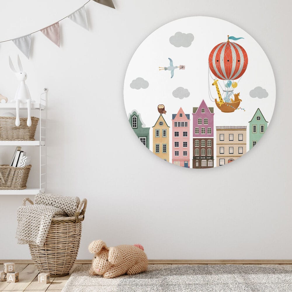Onze prachtige ronde kunstwerken geven stijl aan elke kinderkamer, babykamer of speelkamer. In een handomdraai tover je de kamer om tot een fijne plek! Muurcirkel ‘Stad en luchtballonnen’ wordt op een licht materiaal geproduceerd, heeft een uitstekende kleurweergave en een lichte structuur. Hierdoor krijgt de wandcirkel een stoere look.