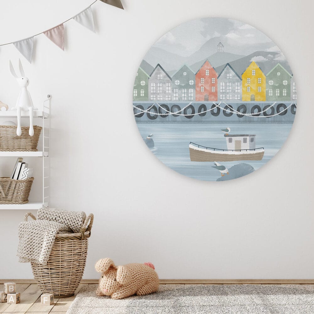 Voor kinderen die van scheepvaart en visserij houden, is deze muurcirkel perfect. De gekleurde huisjes zorgen voor een vrolijke touch.