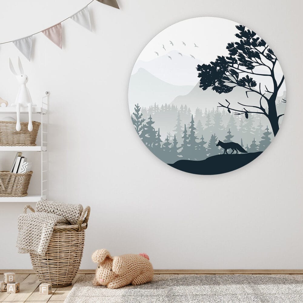 Onze prachtige ronde kunstwerken geven stijl aan elke kinderkamer, babykamer of speelkamer. In een handomdraai tover je de kamer om tot een fijne plek! Muurcirkel ‘Vos in mistig bos’ wordt op een licht materiaal geproduceerd, heeft een uitstekende kleurweergave en een lichte structuur. Hierdoor krijgt de wandcirkel een stoere look.
