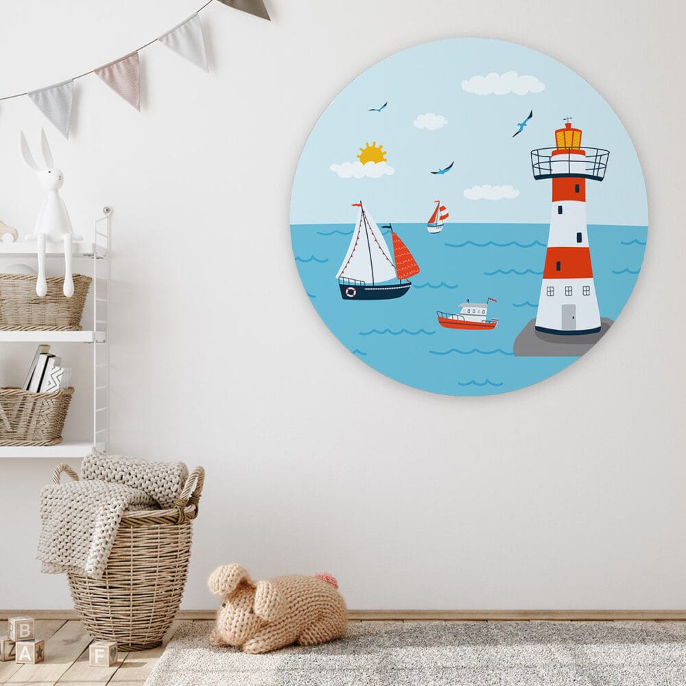 Onze prachtige ronde kunstwerken geven stijl aan elke kinderkamer, babykamer of speelkamer. In een handomdraai tover je de kamer om tot een fijne plek! Muurcirkel ‘Vuurtoren aan zee’ wordt op een licht materiaal geproduceerd, heeft een uitstekende kleurweergave en een lichte structuur. Hierdoor krijgt de wandcirkel een stoere look.